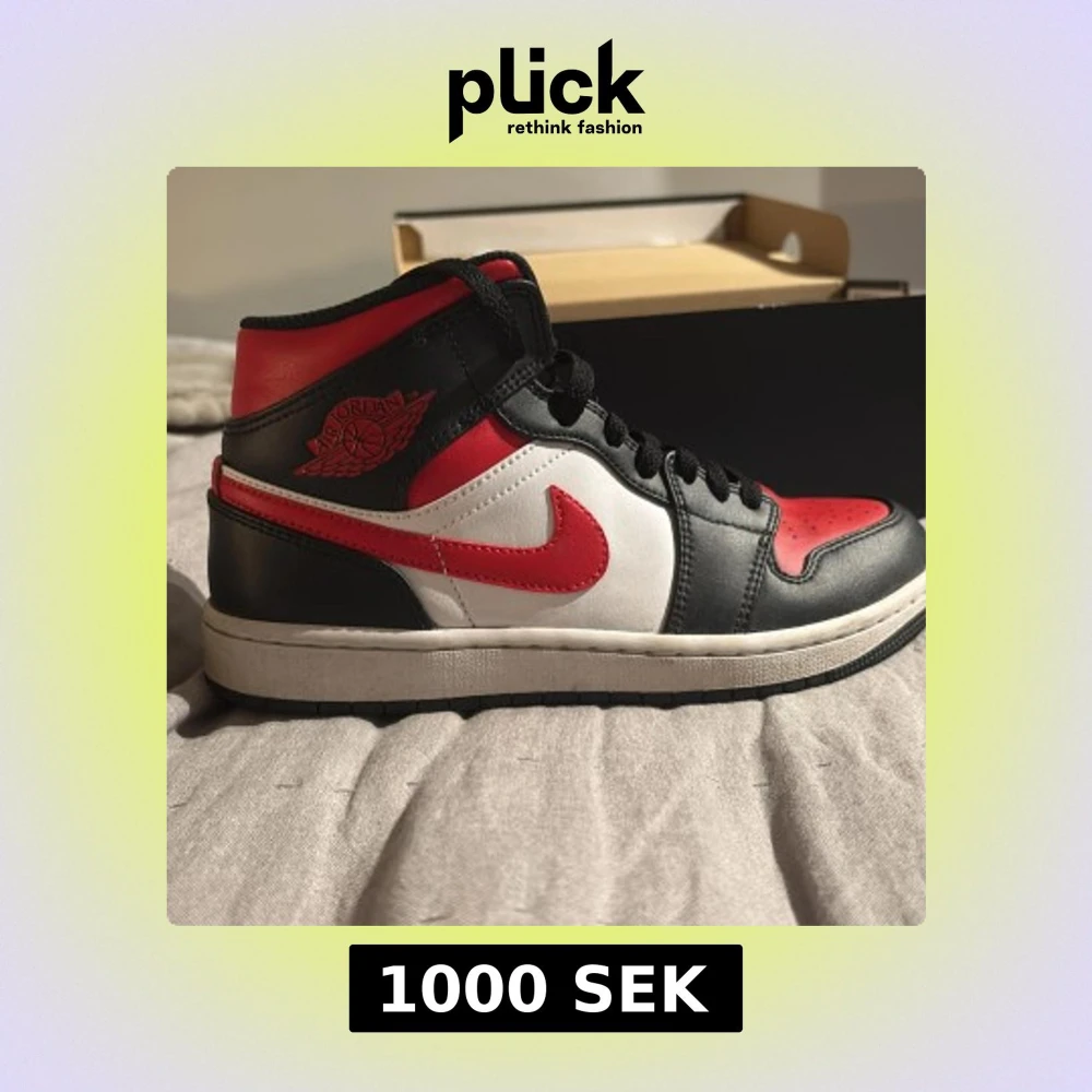 Säljer ett par Nike Air Jordan 1 High med klassisk färgkombination i rött, svart och vitt. Skorna har svart snörning, röd swoosh och detaljer samt vit mellansula. Tillverkade i skinn med rund tå och högt skaft. Perfekta för dig som vill sticka ut med en ikonisk sneaker.