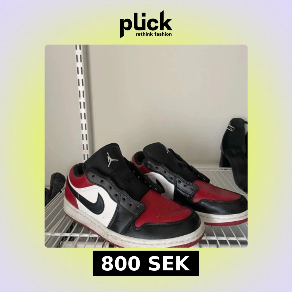 Snygga Nike Air Jordans i klassisk färgkombination av svart, röd och vit. Skorna har en ikonisk design med snörning och rund tå. Perfekta för dig som vill ha en stilren och sportig look. Köpt på zalando för 1200kr och sparsamt använd, ca 4 gånger.