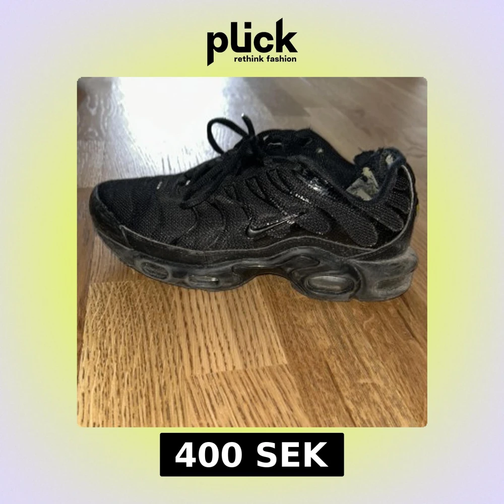 Svarta Nike Air Max Plus TN sneakers med mesh- och syntetöverdel, tydliga TN-detaljer på hälen och vågformade paneler. Skon har snörning och en robust sula med synliga luftkuddar för extra komfort. Perfekt för dig som gillar streetwear.