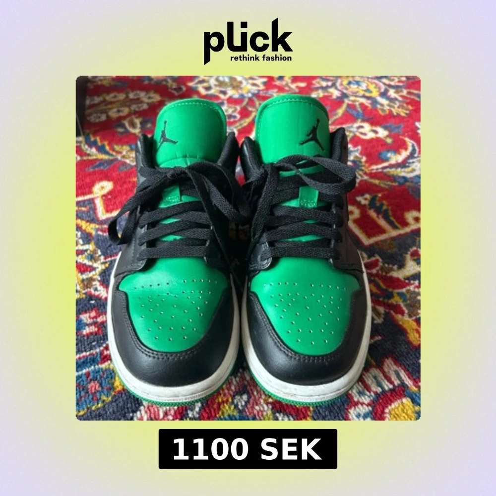 Säljer ett par Nike Air Jordans Low med grön ovandel, svarta detaljer. Skorna har klassisk Air Jordan-logga på hälen och svart snörning. Som nya använt 1 gång och Perfekta för dig som vill sticka ut med färg och stil.