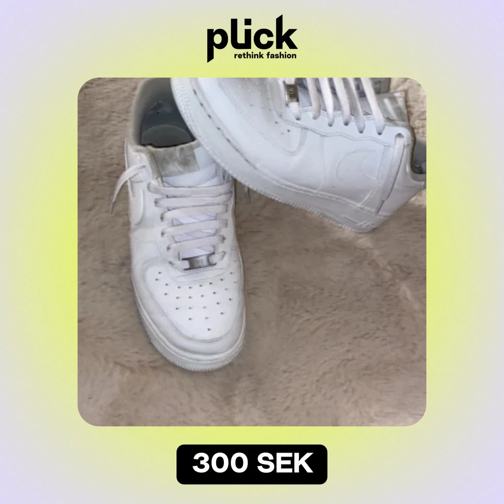 Säljer ett par klassiska vita Nike Air Force sneakers. De är i skinn och har den ikoniska Nike-loggan på sidan. Skorna har snörning och en bekväm passform, perfekt för vardagsbruk. Lite slitna men fortfarande i bra skick.