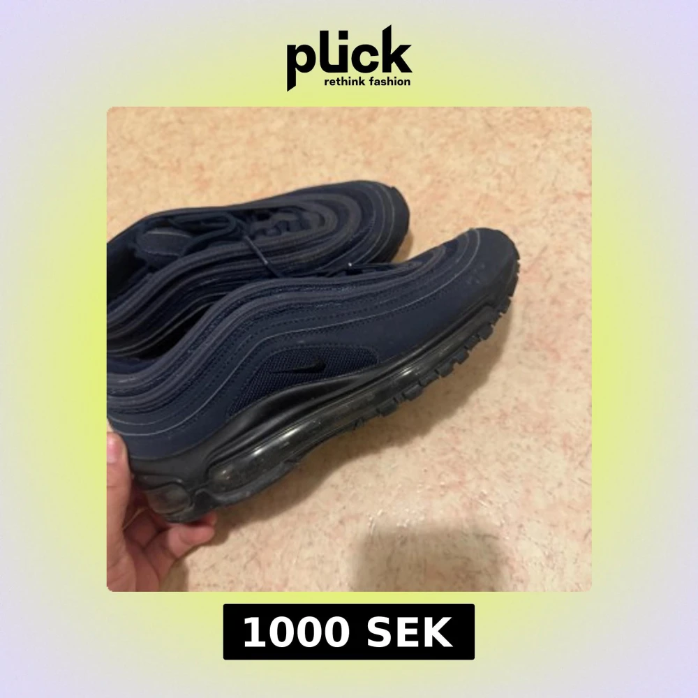 Säljer ett par Nike Air Max 97 sneakers i marinblått med svarta detaljer. Skorna har den klassiska vågiga designen, synlig Air Max-sula och snörning. Ovandelen är i syntet och mesh för en sportig vibe. Perfekta för dig som gillar streetwear och vill sticka ut.
