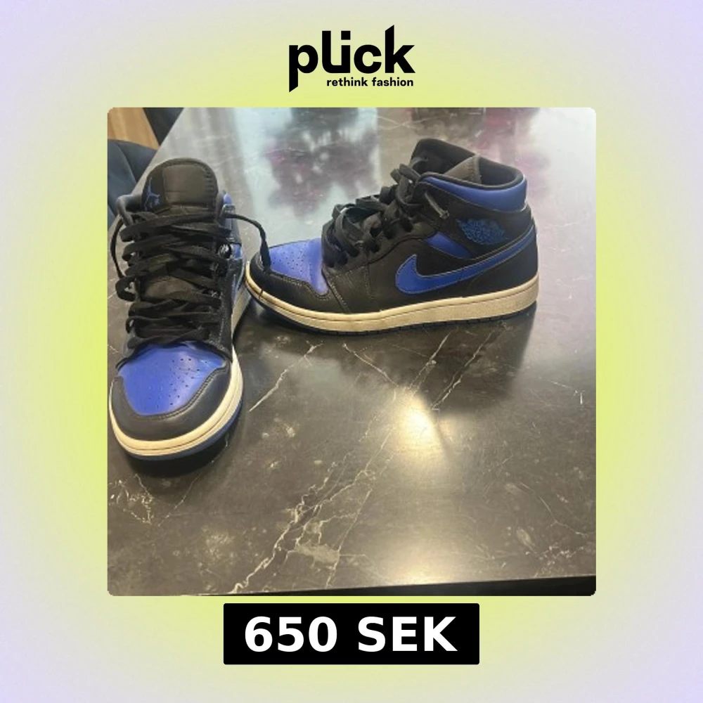 Säljer ett par Nike Air Jordan 1 sneakers i svart och blått skinn. Skorna har varit använt och har bara ett problem med snören men det kan bytas ut priset kan diskuteras vid snabb affär frakt funkar även.