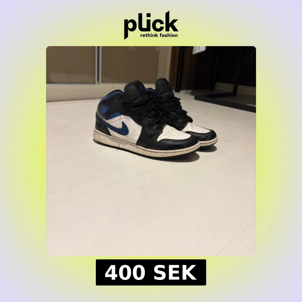 Snygga Nike Air Jordans i en klassisk färgkombination av svart, blå och vit. Skorna har en ikonisk design med snörning och en bekväm passform. Perfekta för dig som vill ha en stilren look. Det har en liten difekt som du ser på bild 4. Pris kan diskuteras vid snabb affär!