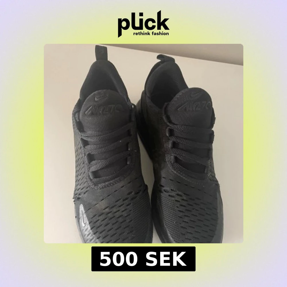 Säljer ett par helsvarta Nike Air Max 270 sneakers med snygg mesh-överdel och klassisk Air Max-sula. Skorna har snörning och en sportig vibe, perfekt för dig som gillar streetstyle. Materialet är en mix av syntet och textil för bästa komfort.