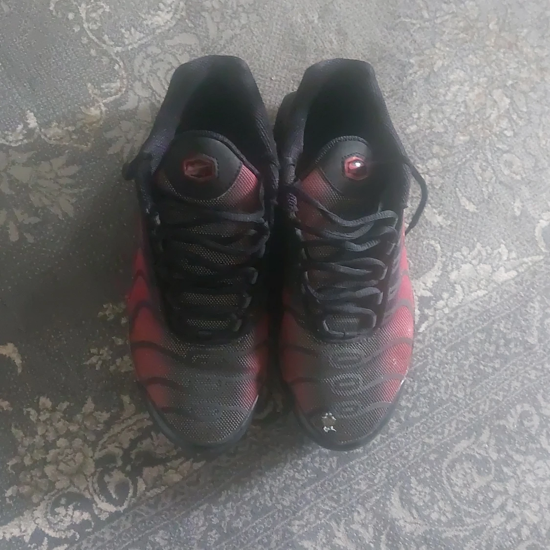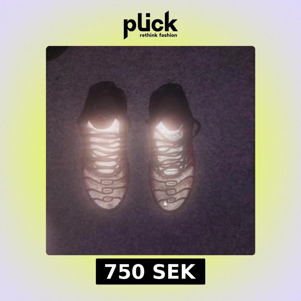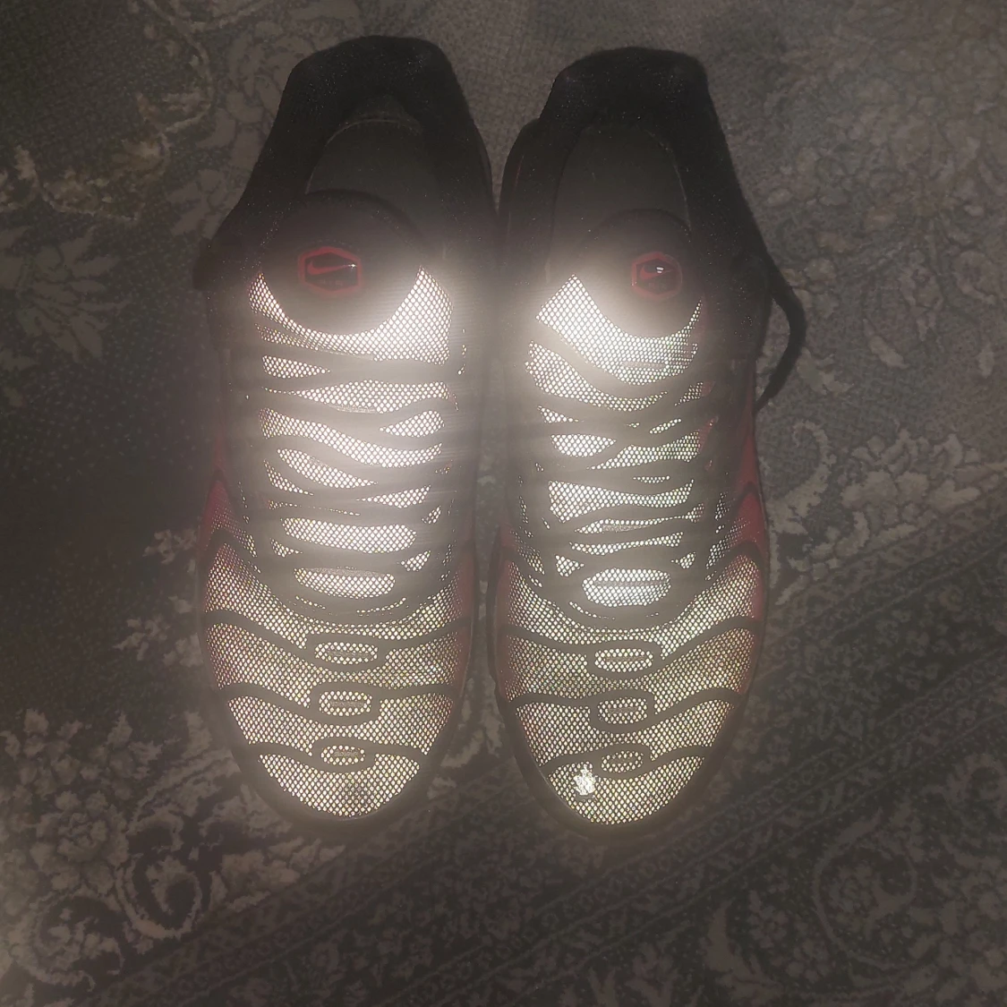 Ett par röda tns är lite förstörd i ena skon dom lyser på kvällen om man tar flash bild