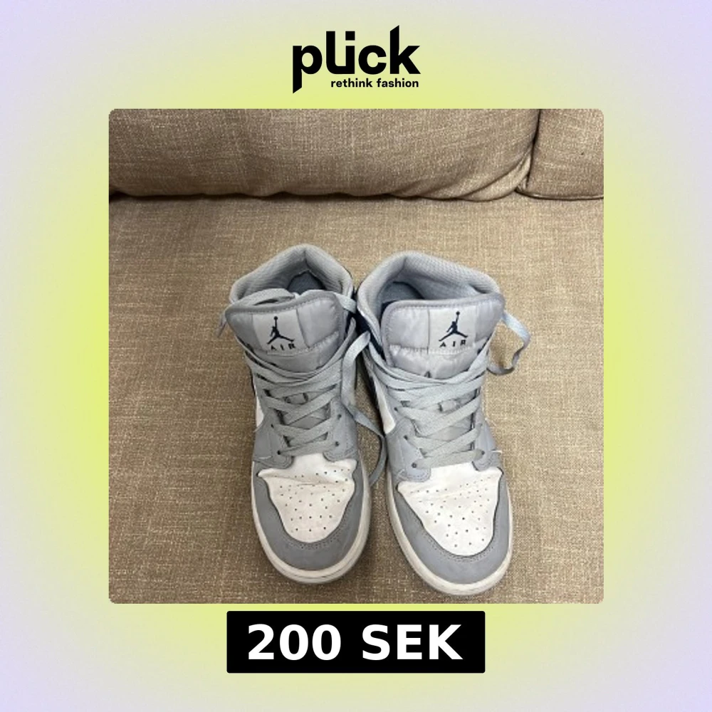 Säljer ett par Nike Air Jordan 1 Mid i grått, vitt och marinblått. Skorna har klassisk hög siluett, snörning och ikoniska swoosh-loggan på sidan. Perfekta för dig som gillar streetwear och sneakers med stilren design.