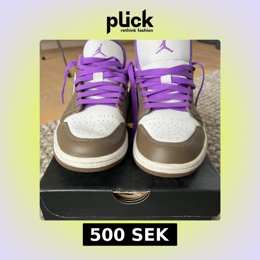 Nike Air Jordan 1 sneakers i vitt och brunt skinn med lila snörning, lila innerfoder och broderad Jumpman-logga på plösen. Klassisk rund tå och platt sula. Perfekt för dig som vill sticka ut med färg på fötterna. Ordinarie pris: 1800kr, säljes för 500kr inkl originalkartong