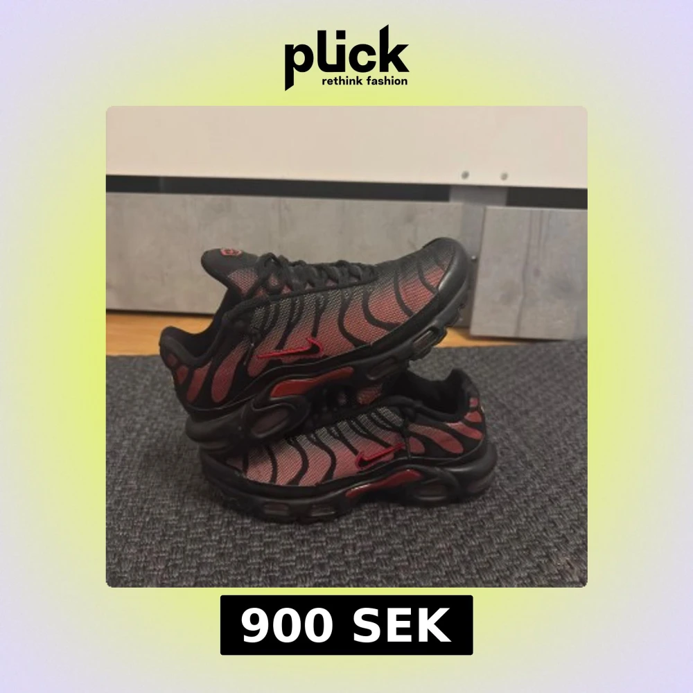 Nike Air Max Plus/Tn sneakers med svart och röd mesh-överdel, svarta vågformade detaljer och röd Swoosh på sidan. Platt sula med synliga Air-enheter och röda inslag på undersidan. Pris kan diskuteras