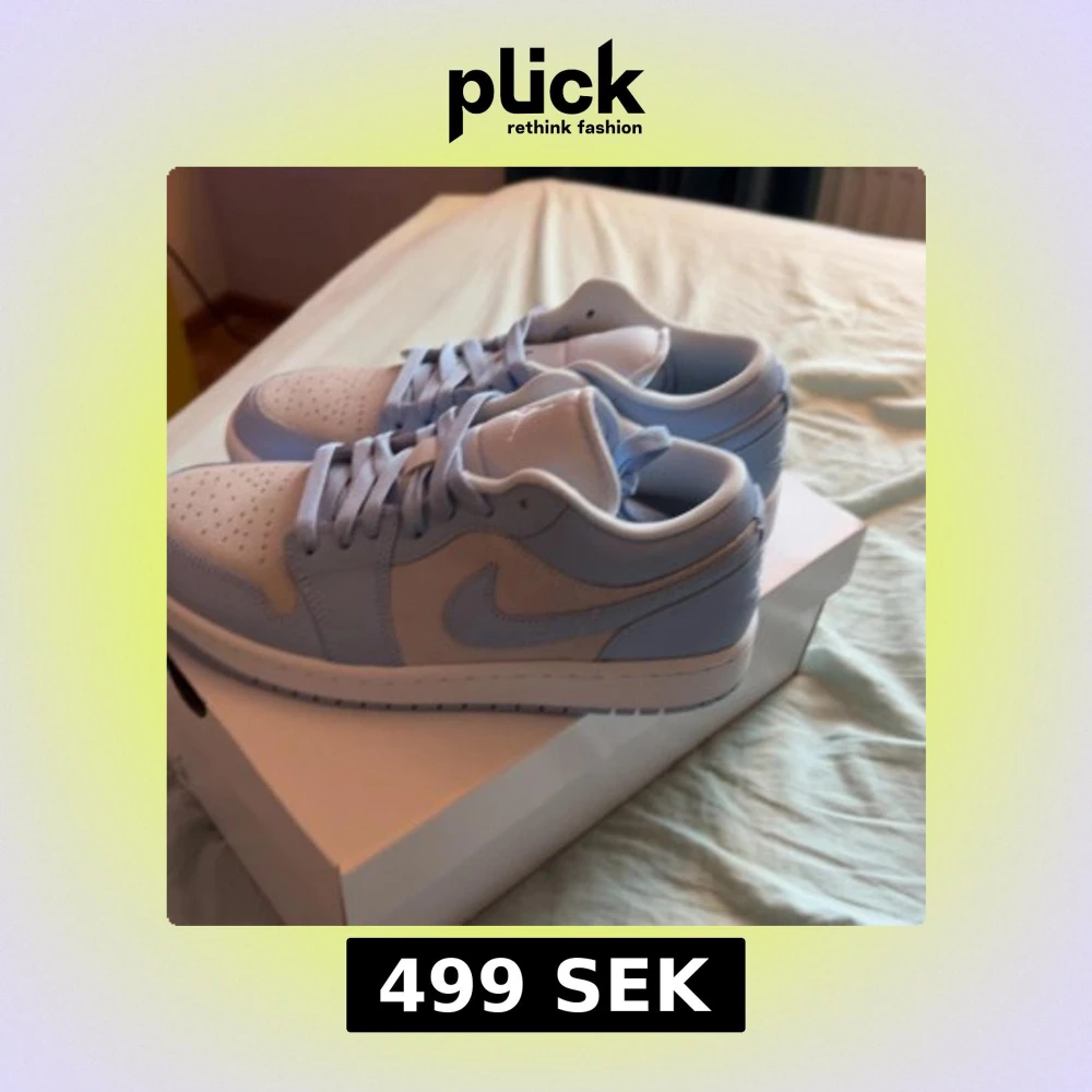 Säljer ett par fräscha Nike Air Jordan 1 Low i en snygg ljusblå och vit färgkombination. Skorna har klassisk snörning, rund tå och är tillverkade i skinn med syntetdetaljer. Perfekta för dig som gillar stilrena sneakers med ikonisk design.