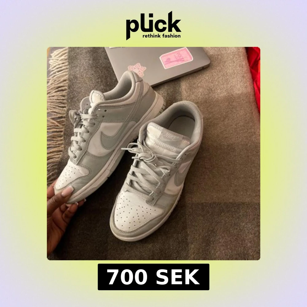 Nike Dunk Low sneakers i en clean ljusgrå och vit färgkombination. Klassisk siluett med rund tå, perforerad tåbox och snörning. Ovandel i skinn och syntet, med ikoniska Swoosh-loggan på sidorna. Perfekta för dig som gillar minimalistisk streetstyle.
