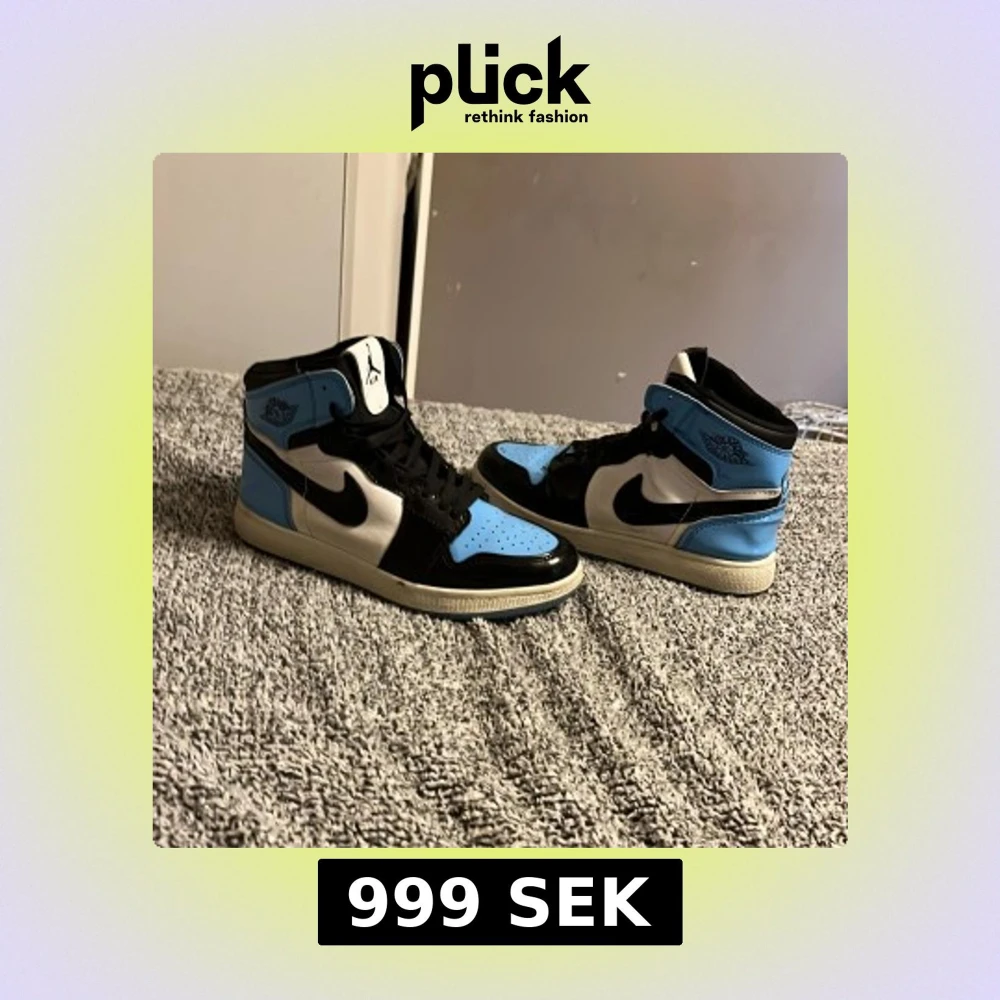 Snygga Nike Air Jordans i en fräsch kombination av blått, svart och vitt. Skorna har en hög design med klassisk snörning och den ikoniska Nike-loggan på sidan.