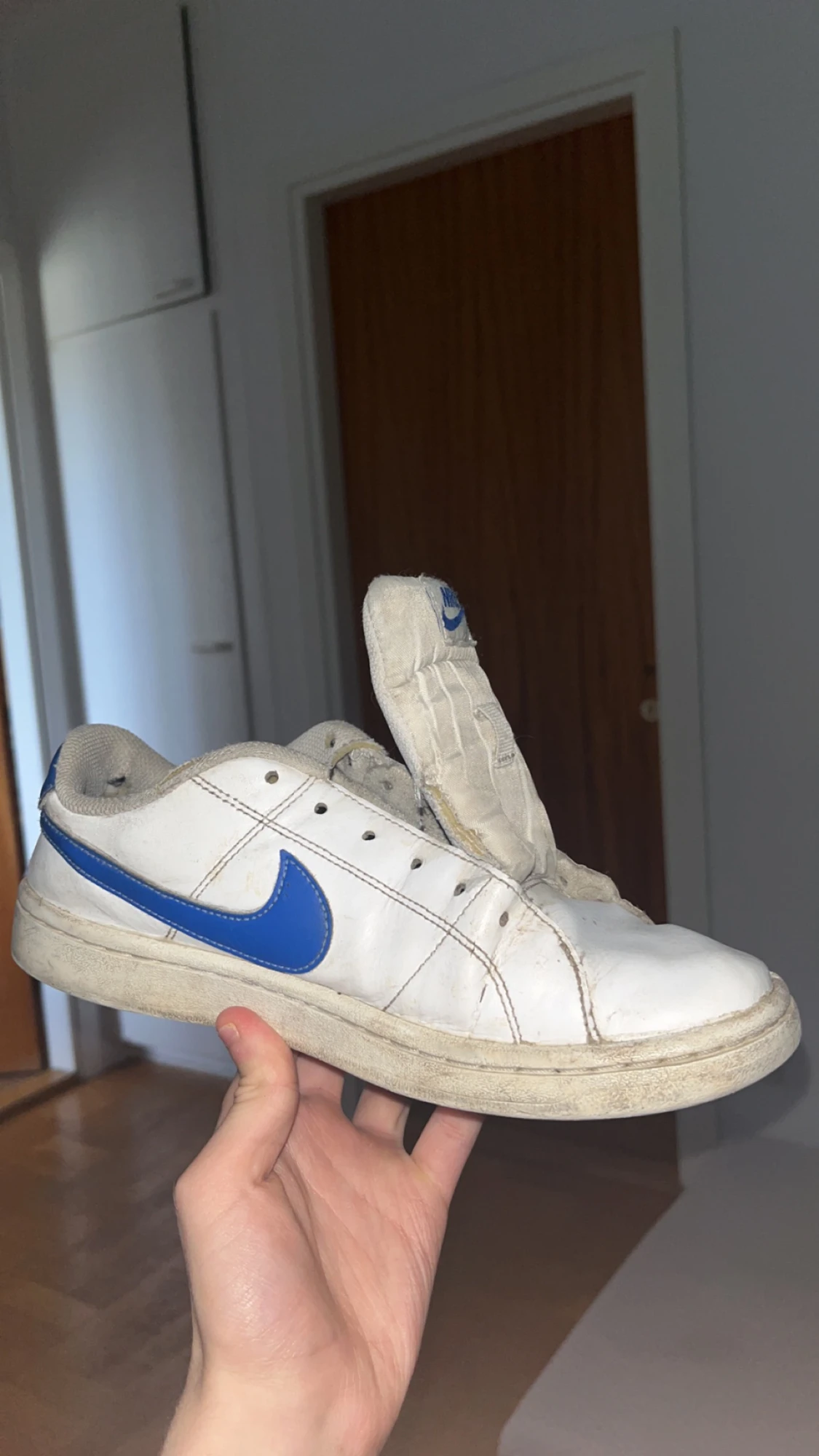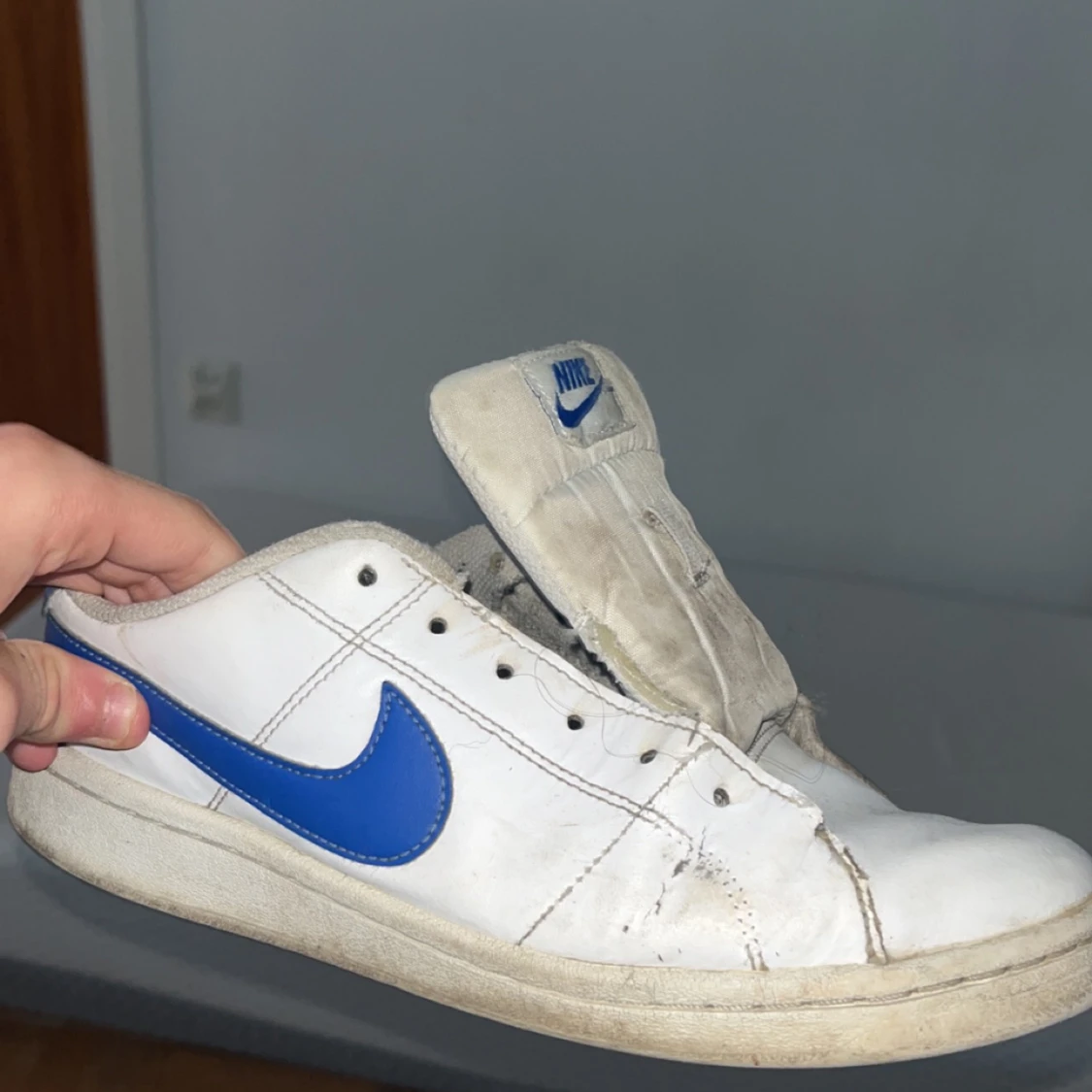 Dem är ganska creaseade men kan tvättas och fixas ganska lätt. Lite sönder och sulorna måste bytas. Säljer inte med snören så därför är skorna billiga
