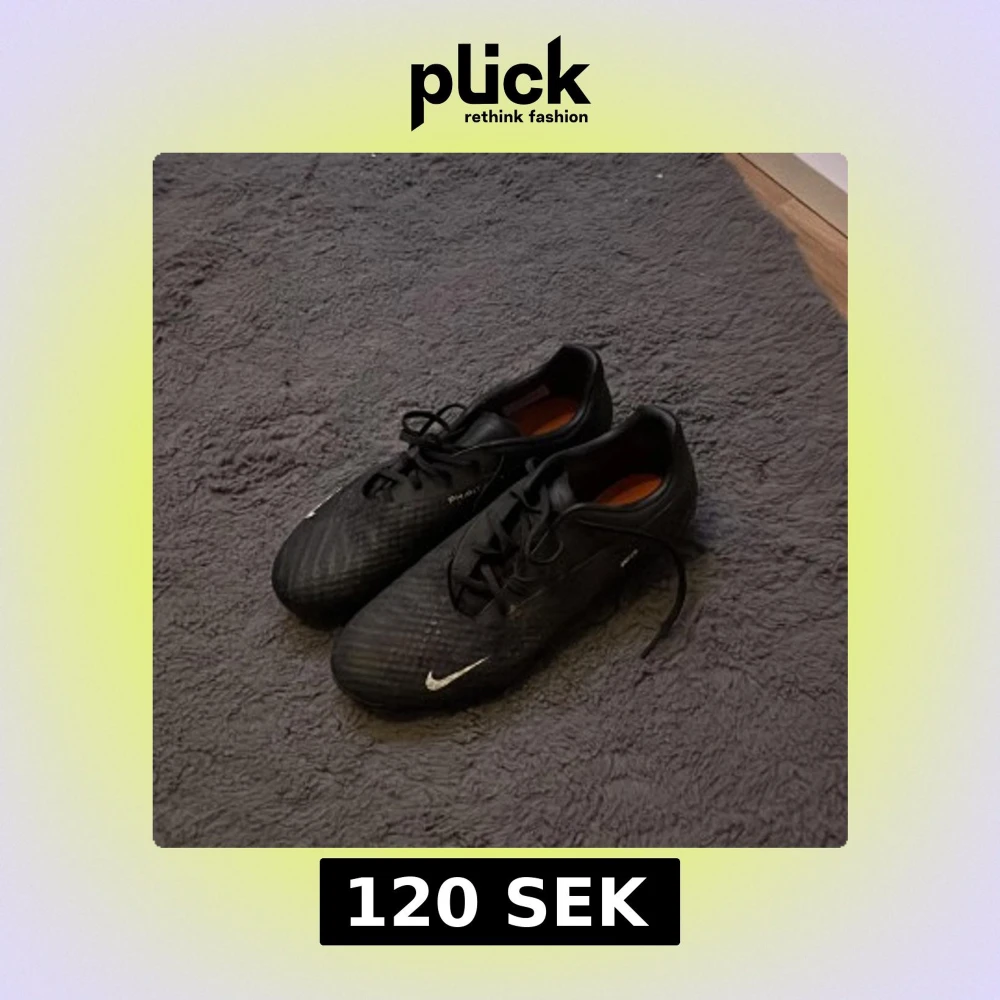 Säljer ett par svarta Nike Phantom GT2 fotbollsskor med orange dobbar och vit swoosh på sidan. Skorna har snörning och är tillverkade i syntetmaterial med en rund tå och platt sula. Perfekta för dig som vill ha grym kontroll på planen.