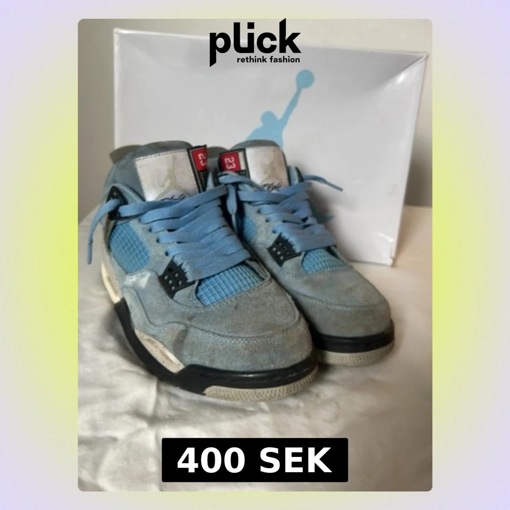 Nike Air Jordan 4 University Blue sneakers med ljusblå mocka, meshpaneler och svarta detaljer. Skorna har vita och grå partier med svarta stänk på mellansulan, samt klassisk snörning och ikonisk Jumpman-logga på plösen. Perfekta för dig som vill sticka ut med stil.