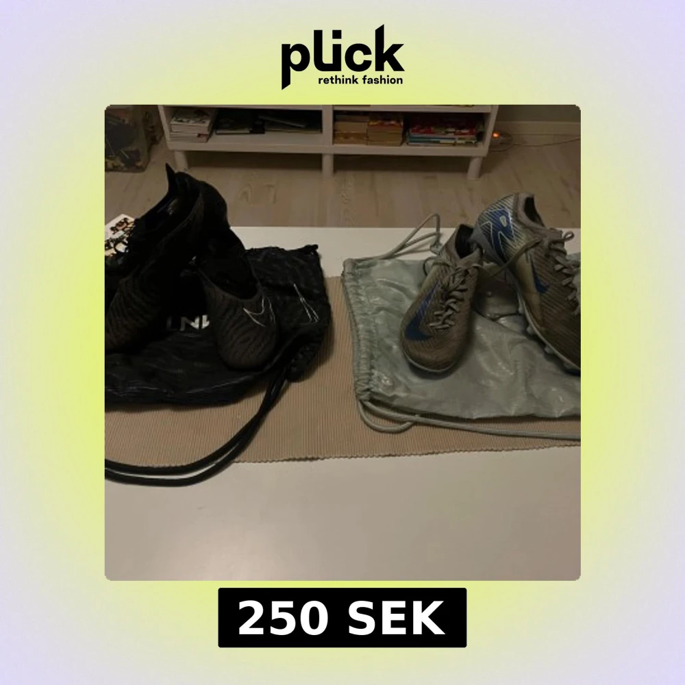 Två par Nike Air Zoom fotbollsskor säljes! Ena paret är gråa med blå detaljer och snörning, det andra är svarta med silverdetaljer och mönstrad ovandel. Båda har platt sula med dobbar och är tillverkade i syntetmaterial. Perfekta för dig som vill sticka ut på planen.