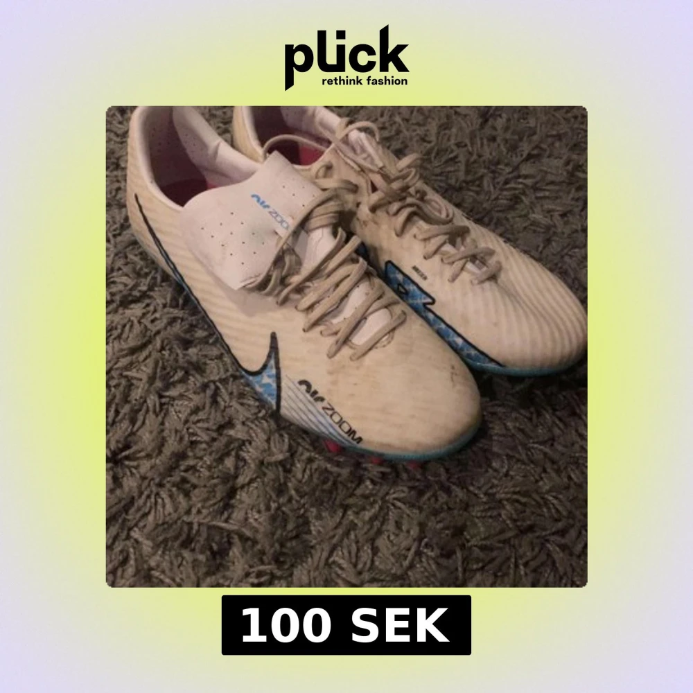 Säljer ett par Nike Air Zoom fotbollsskor i vitt med blå detaljer och svart Nike-logga. Skorna har snörning och mönstrad sula med rosa och svarta dobbar. Perfekta för dig som vill ha snygga och funktionella skor på planen.
