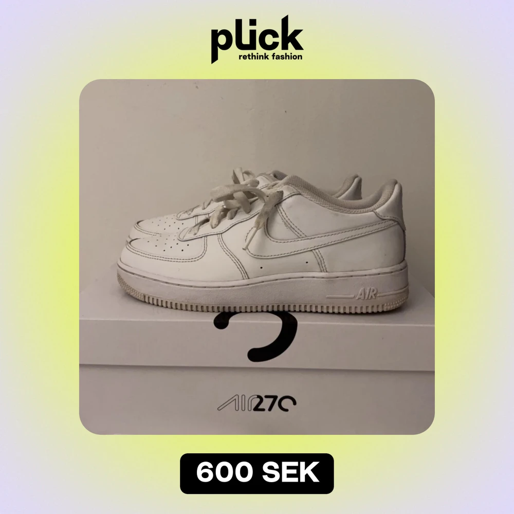 Säljer ett par klassiska vita Nike Air Force sneakers i bra skick. De har en stilren design med snörning och perforerade detaljer för ventilation. Perfekta för vardagsbruk och passar till nästan alla outfits. Skorna är bekväma och har en stadig sula.