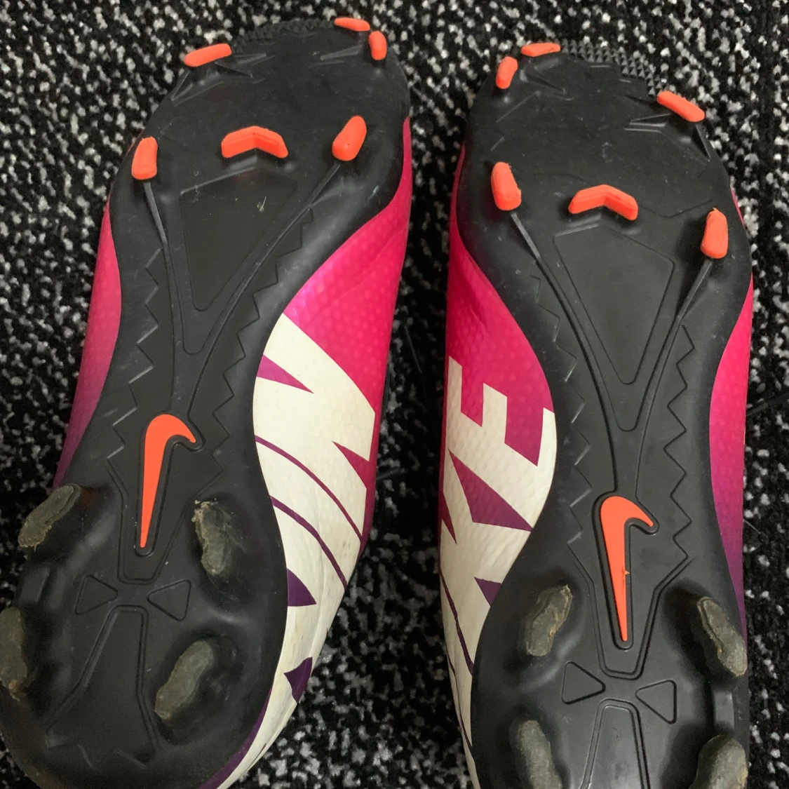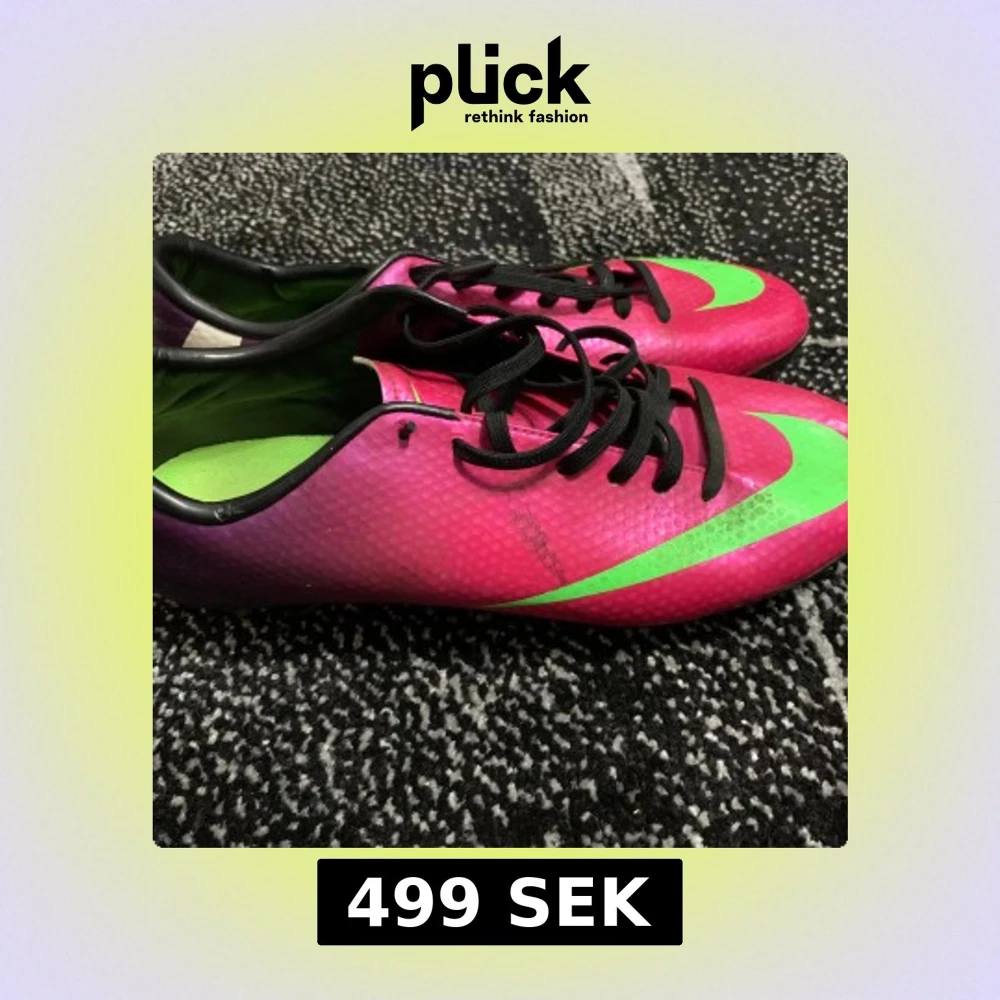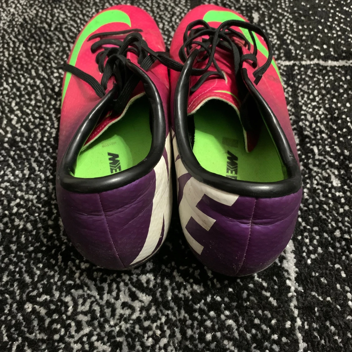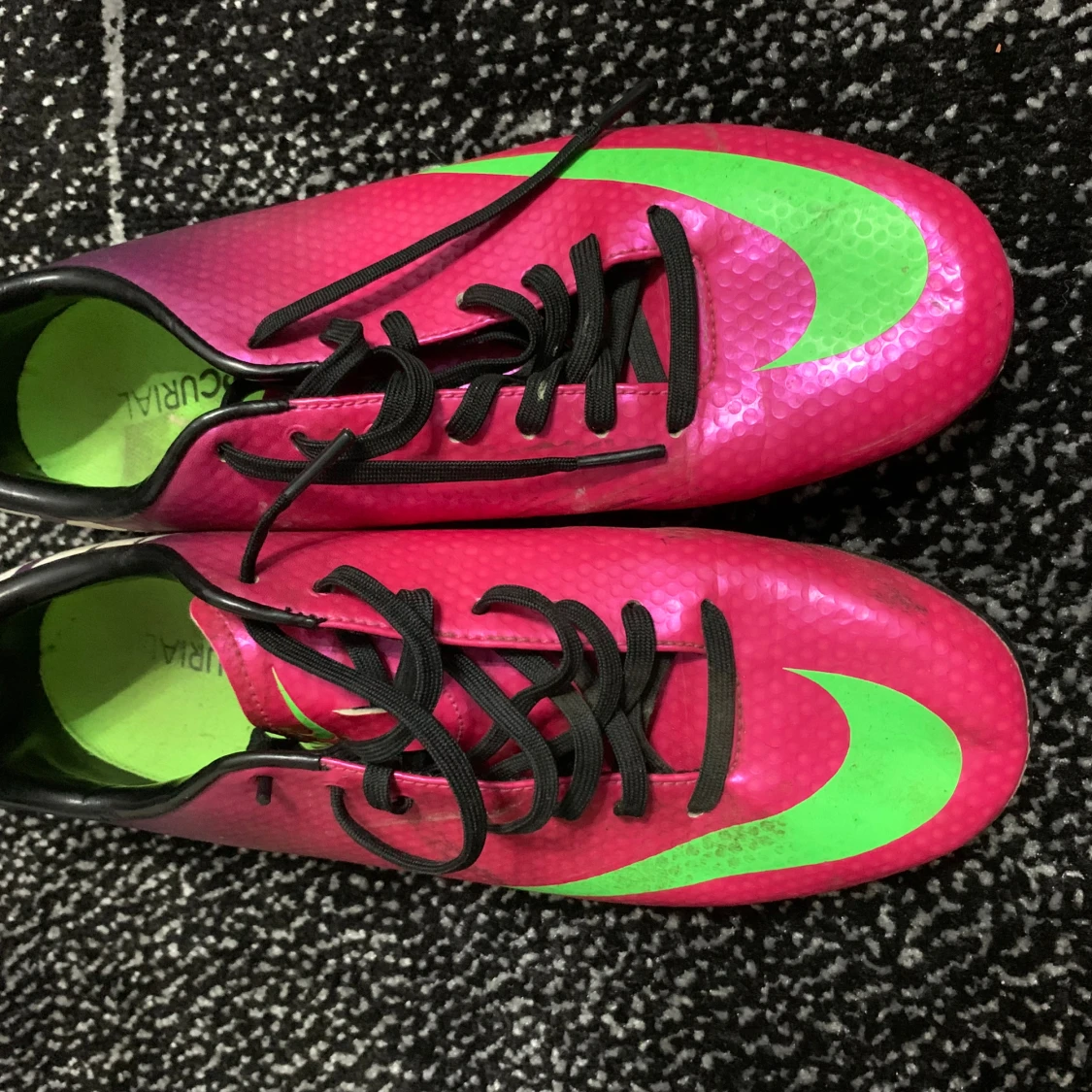 Säljer ett par Nike fotbollsskor i en riktigt fet färgkombo – starkt rosa med gröna detaljer och svart snörning. Skorna har en texturerad syntetisk ovandel, svart sula med orange dobbar och coolt tryck baktill. Perfekta för dig som vill sticka ut på planen.