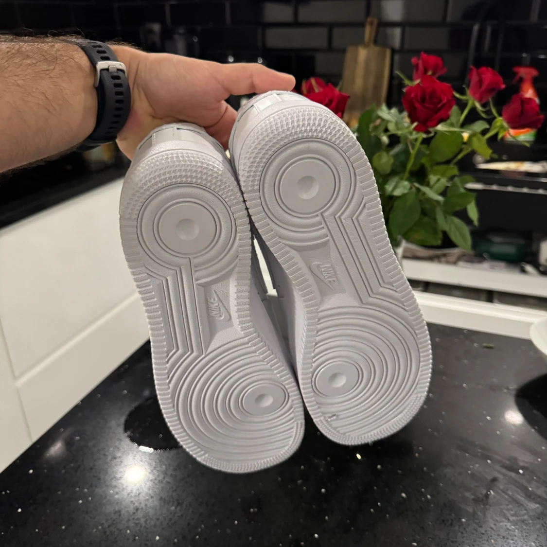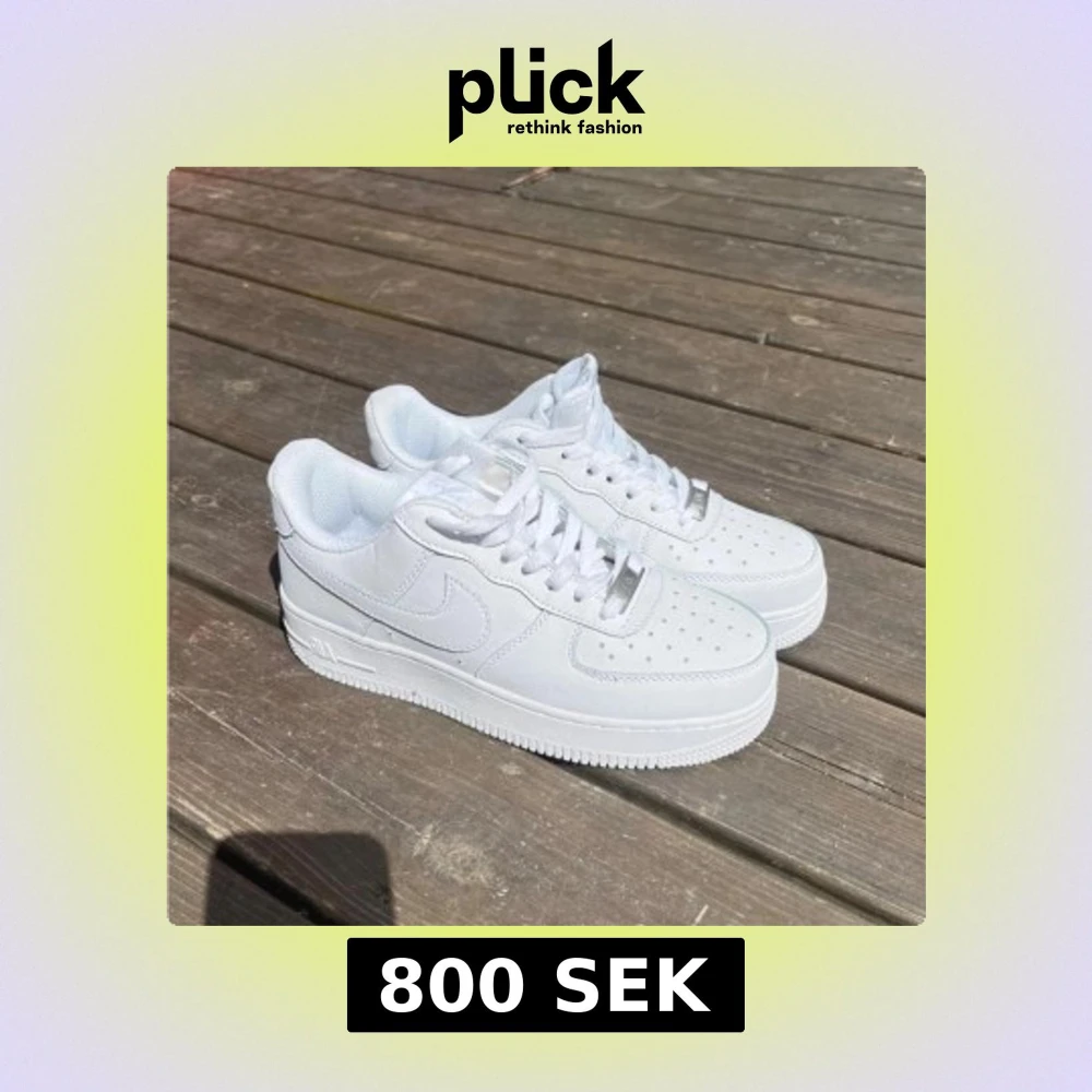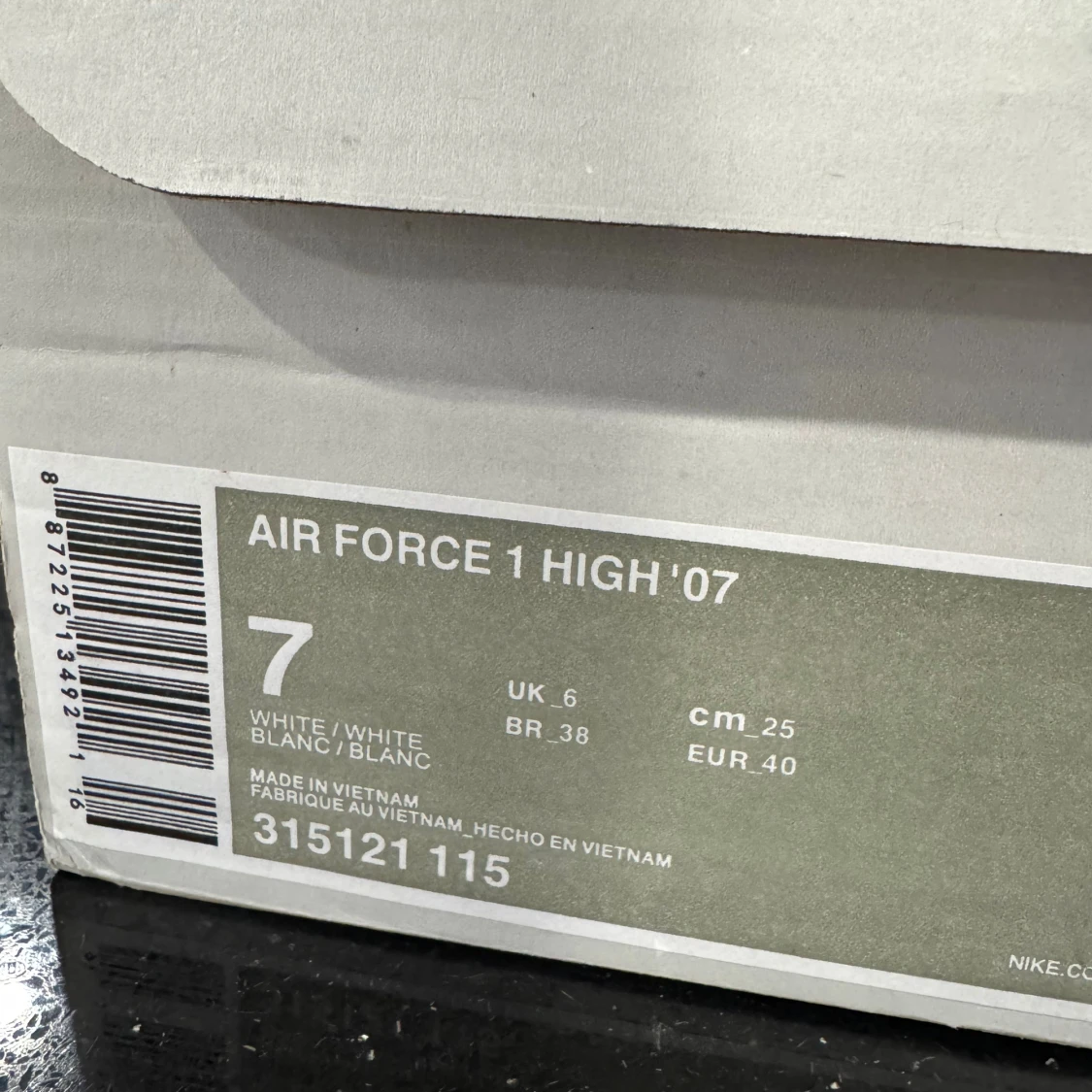 Säljer ett par klassiska Nike Air Force 1 High '07 i helvitt skinn. Skorna har en clean och tidlös look med rund tå, snörning och platt sula. Perfekta för dig som vill ha en ikonisk sneaker med streetkänsla. Storlek 40.