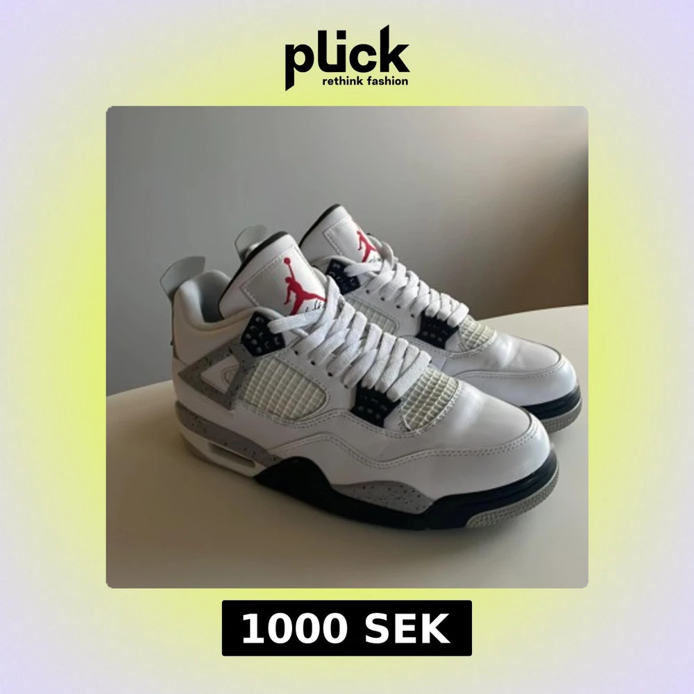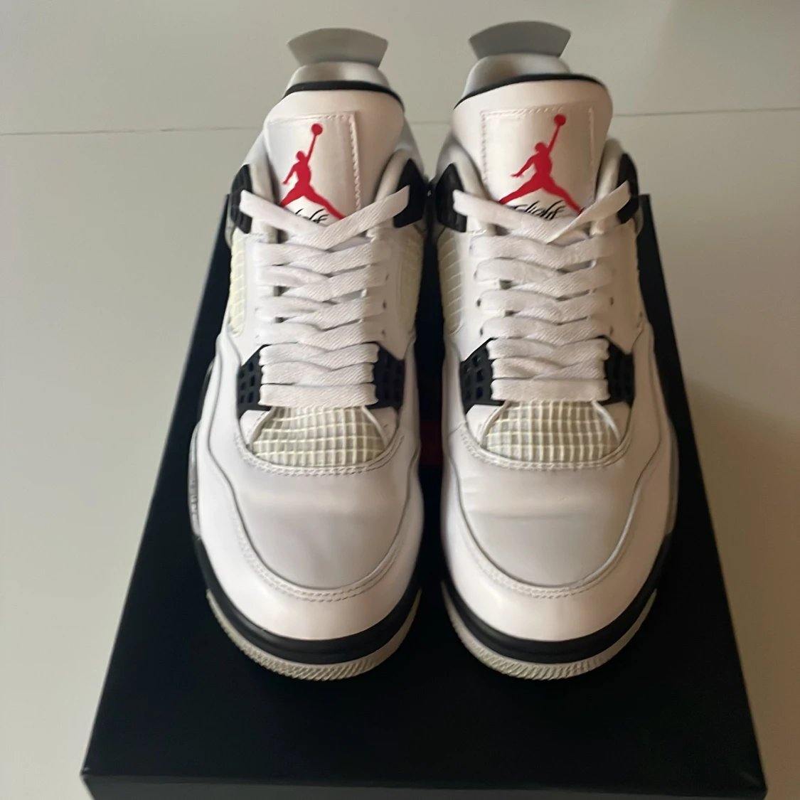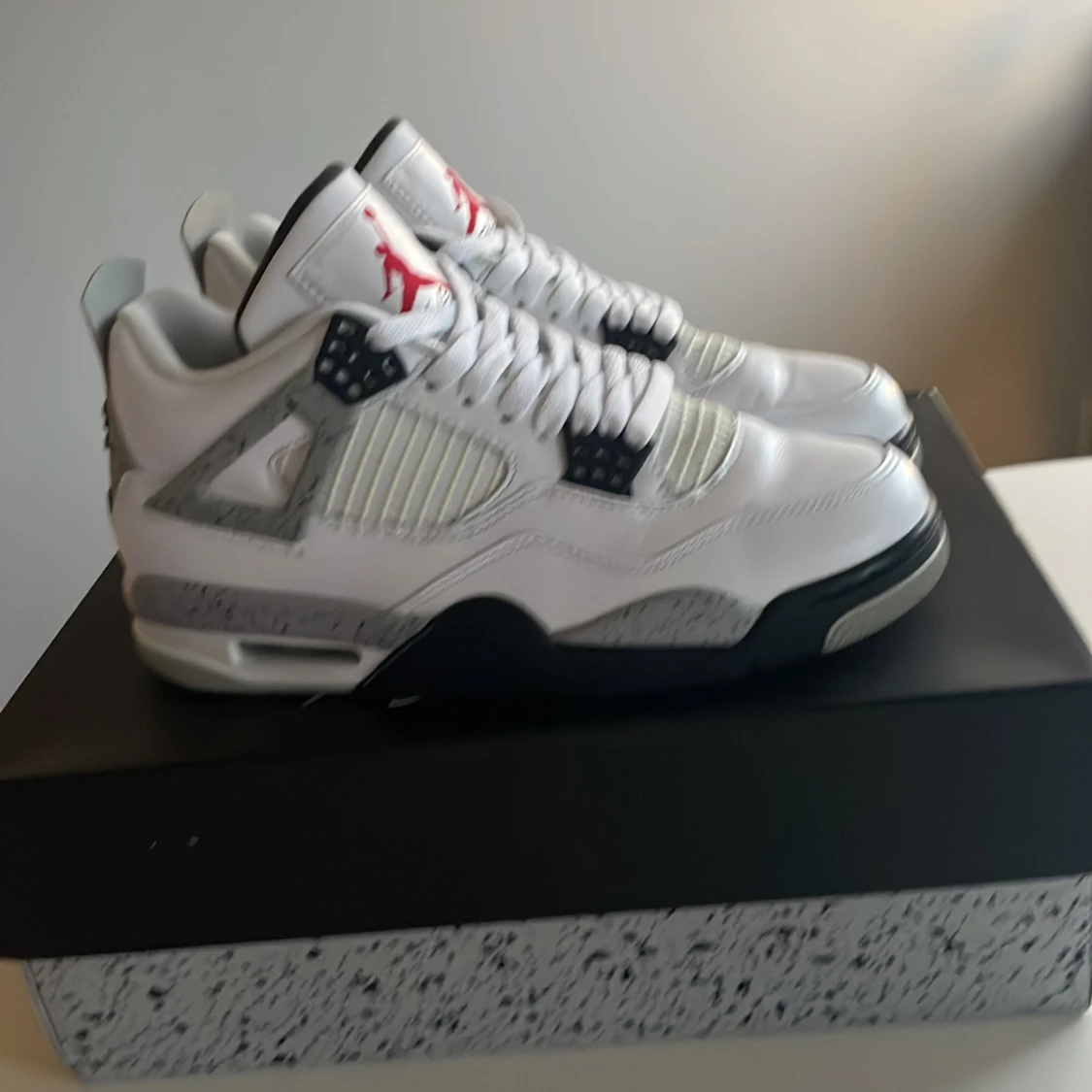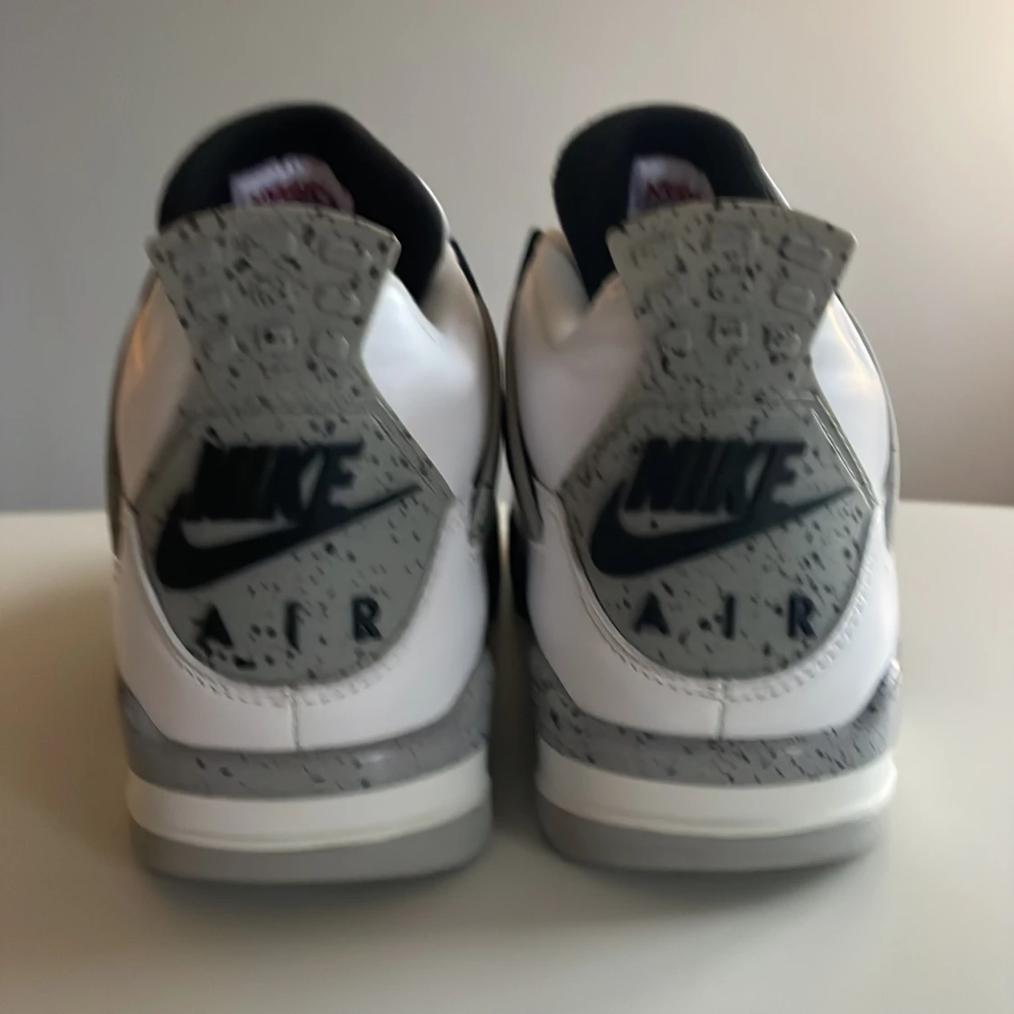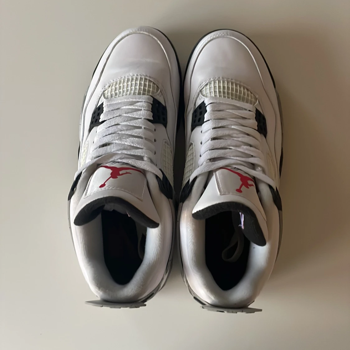 Nike Air Jordan 4 White Cement sneakers med vit ovandel i skinn, grå och svarta detaljer samt röd Jumpman-logga på plösen. Grått stänkmönster på häl och mellansula, meshpaneler på sidorna och klassisk snörning. Perfekta för dig som gillar retrostil och streetwear.