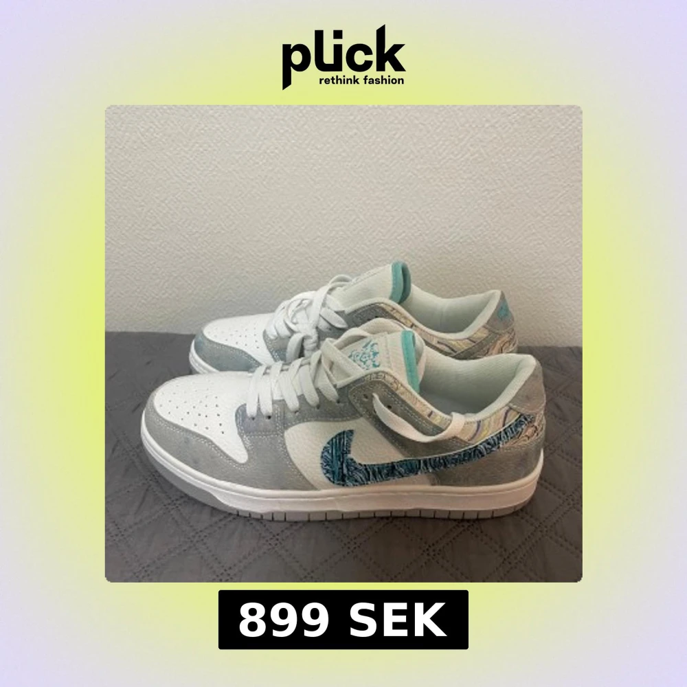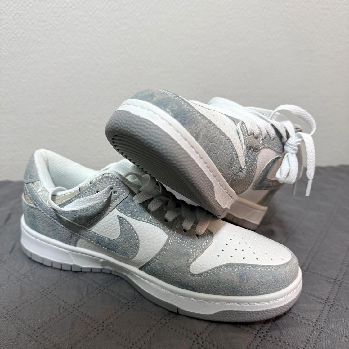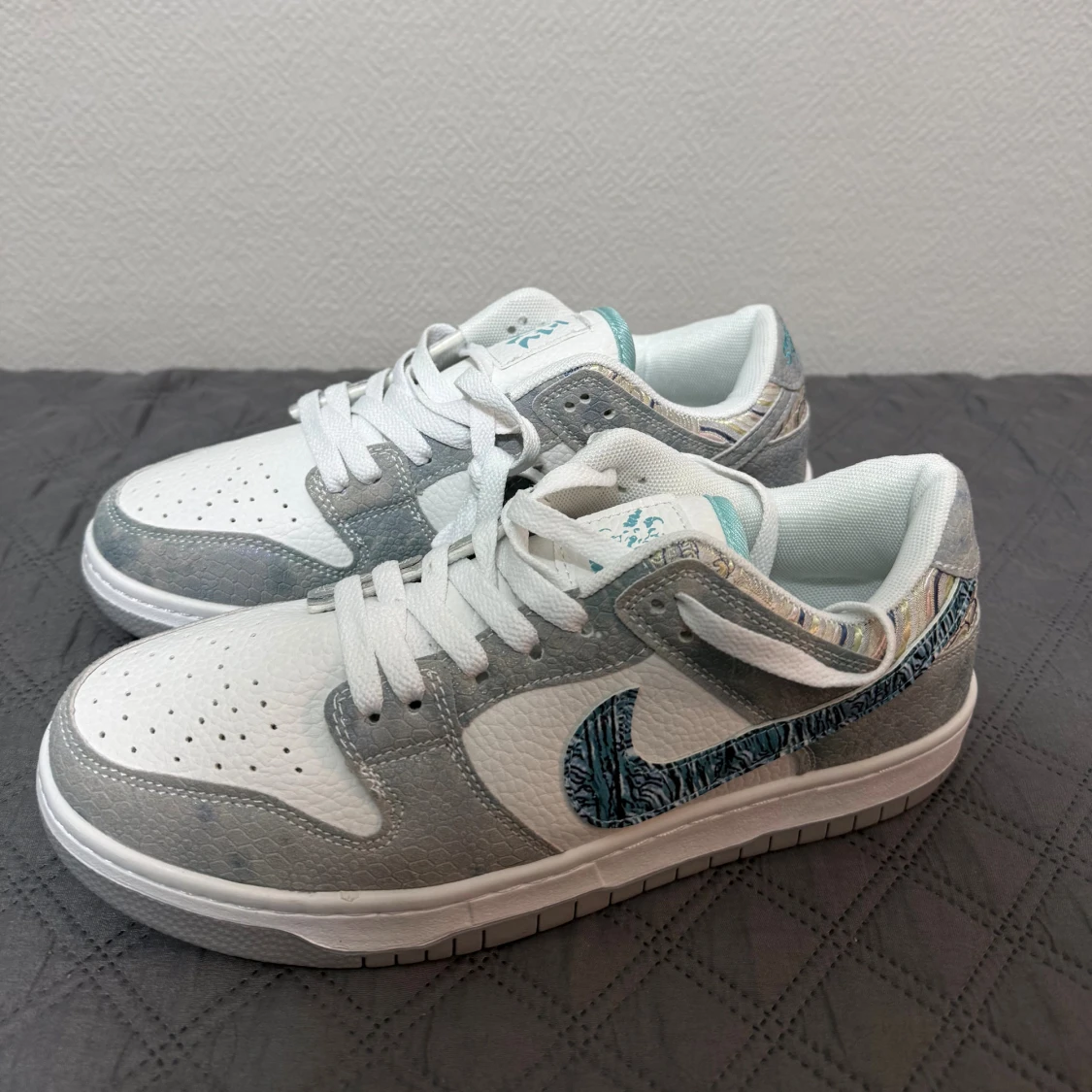 Nike Dunk Low sneakers i vitt och ljusgrått skinn med texturerad yta. Swoosh-loggan har ett blått och svart mönster som sticker ut, och detaljer i turkos på plösen. Klassisk låg modell med snörning och perforerad tå för extra stil.