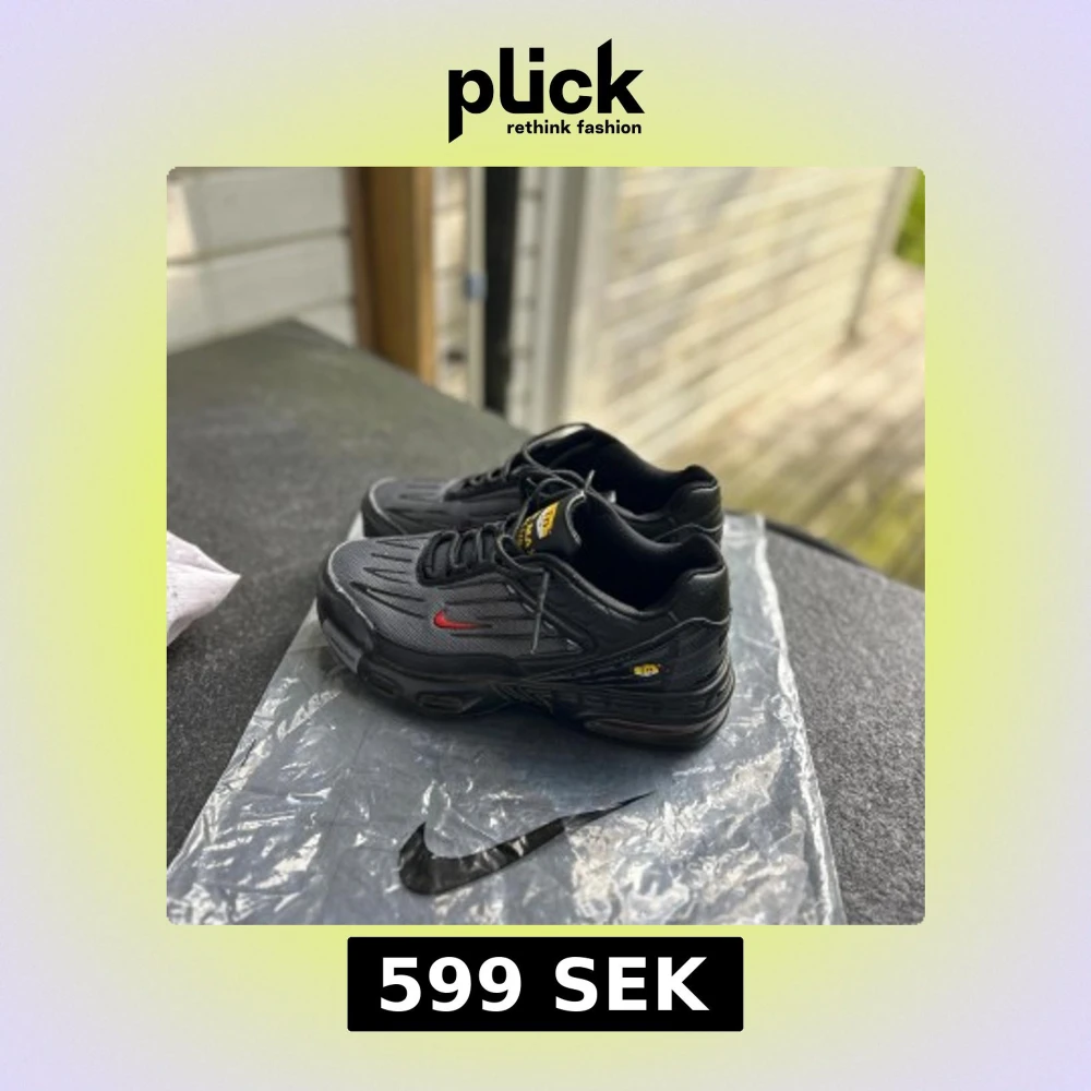 Nike Air Max Plus sneakers i svart och grå mesh med röda swoosh-detaljer och gula TN-loggor. Skorna har snörning, platt sula och tydlig Air Max-dämpning. Perfekta för dig som gillar en sportig och modern look med extra komfort.