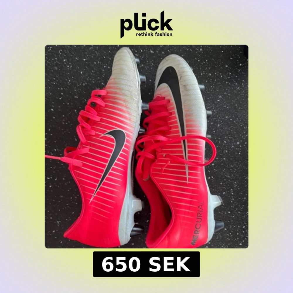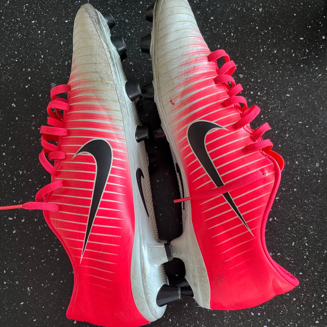 Säljer ett par Nike Mercurial fotbollsskor i röd och vit färg med svarta detaljer. Skorna har snörning och är designade för optimal prestanda på planen.