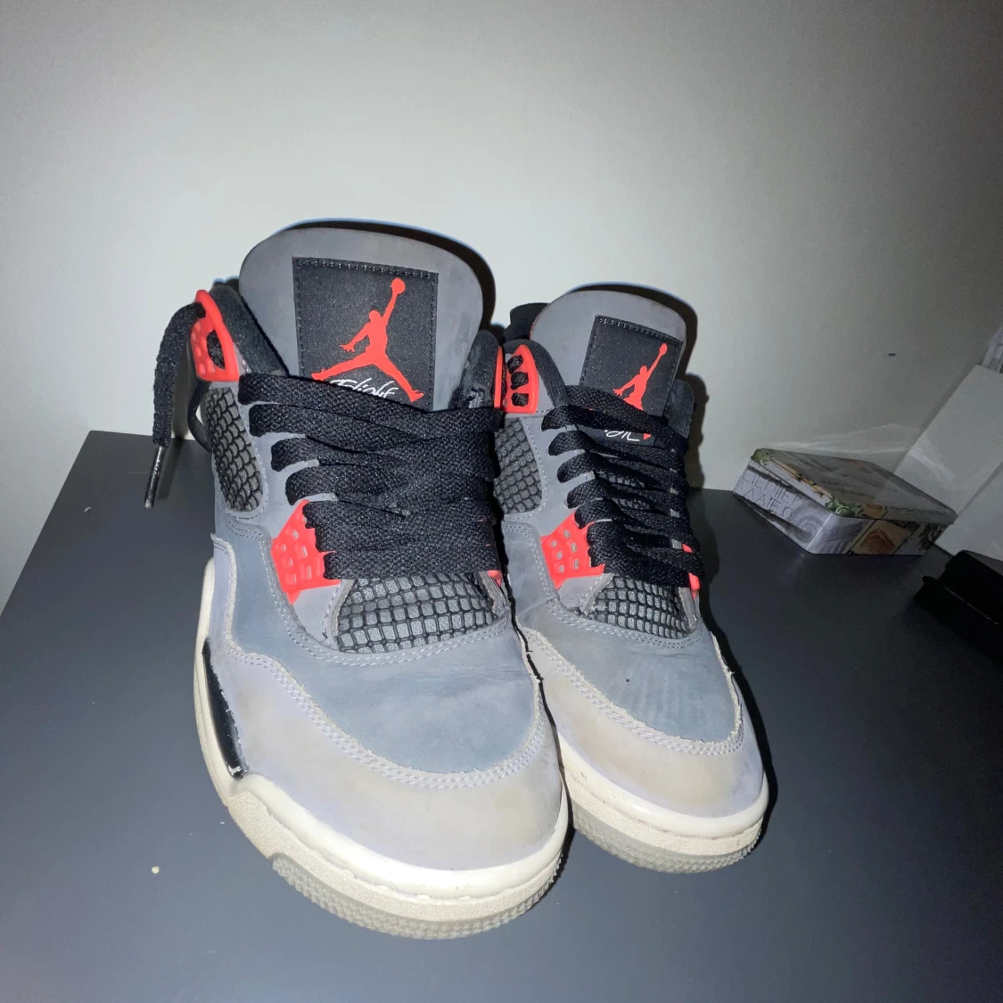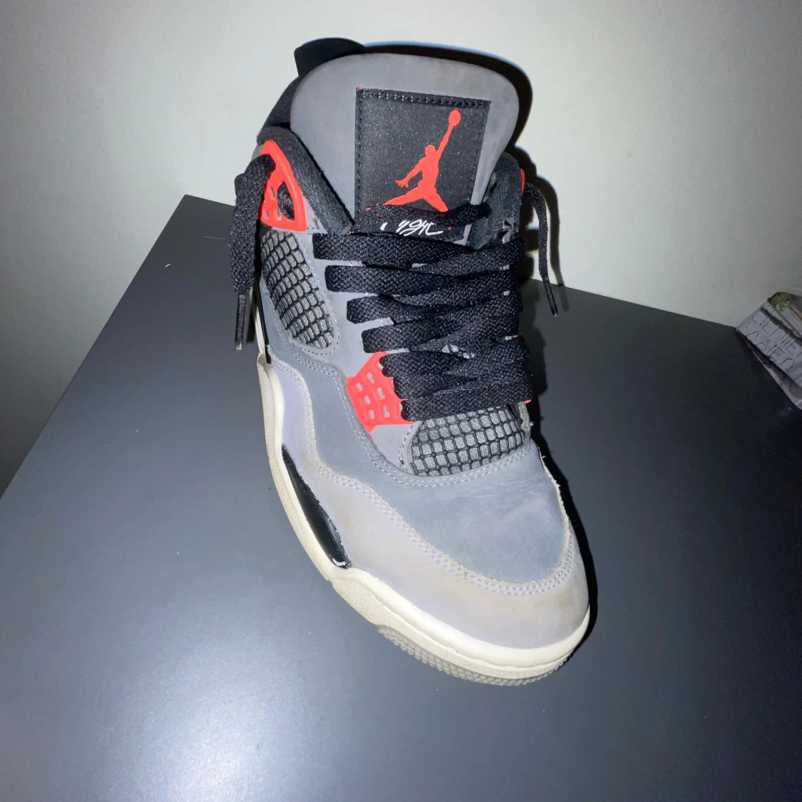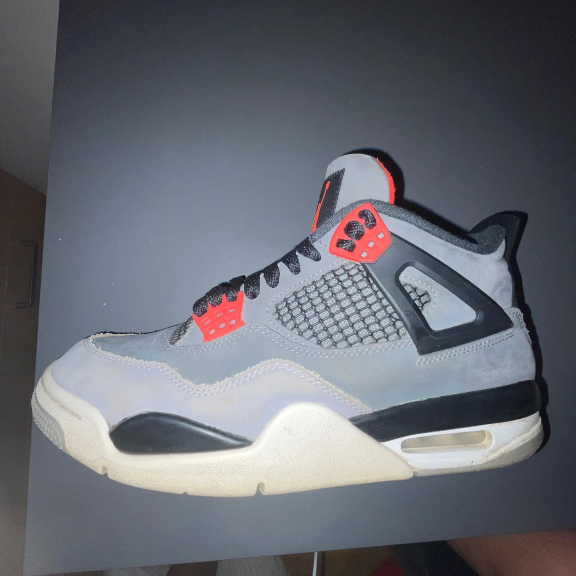 Snygga Nike Air Jordans i grått och svart med röda detaljer. Skorna har en klassisk design med snörning och en synlig luftdämpning i sulan. Perfekta för dig som vill ha en stilren och sportig look.