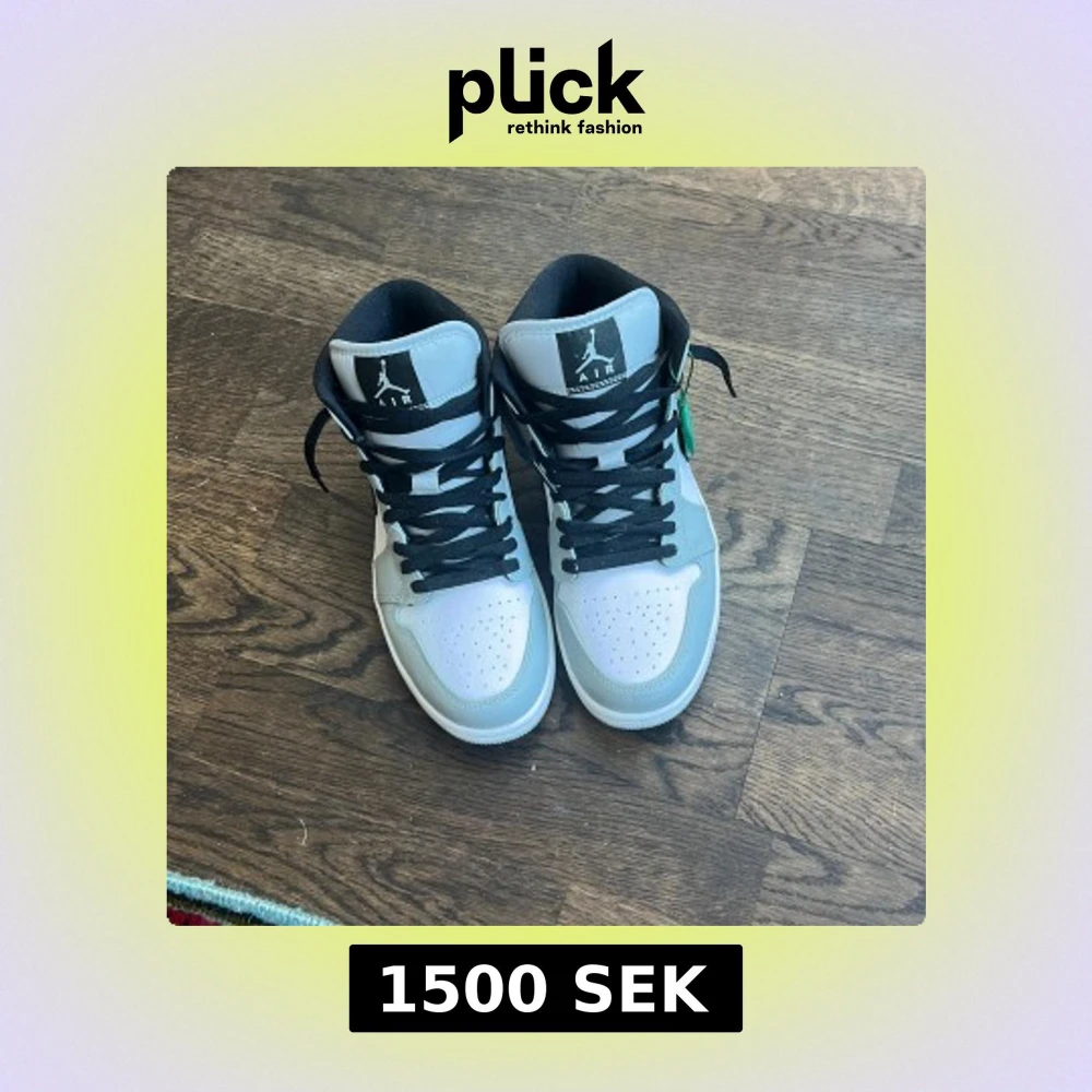Säljer ett par Nike Air Jordan 1 High i vitt och ljusgrått med svarta detaljer och svart swoosh. Skorna har klassisk snörning, hög siluett och är tillverkade i skinn och syntet. Perfekta för storlek 41 väldigt sköna, endast använda en gång.