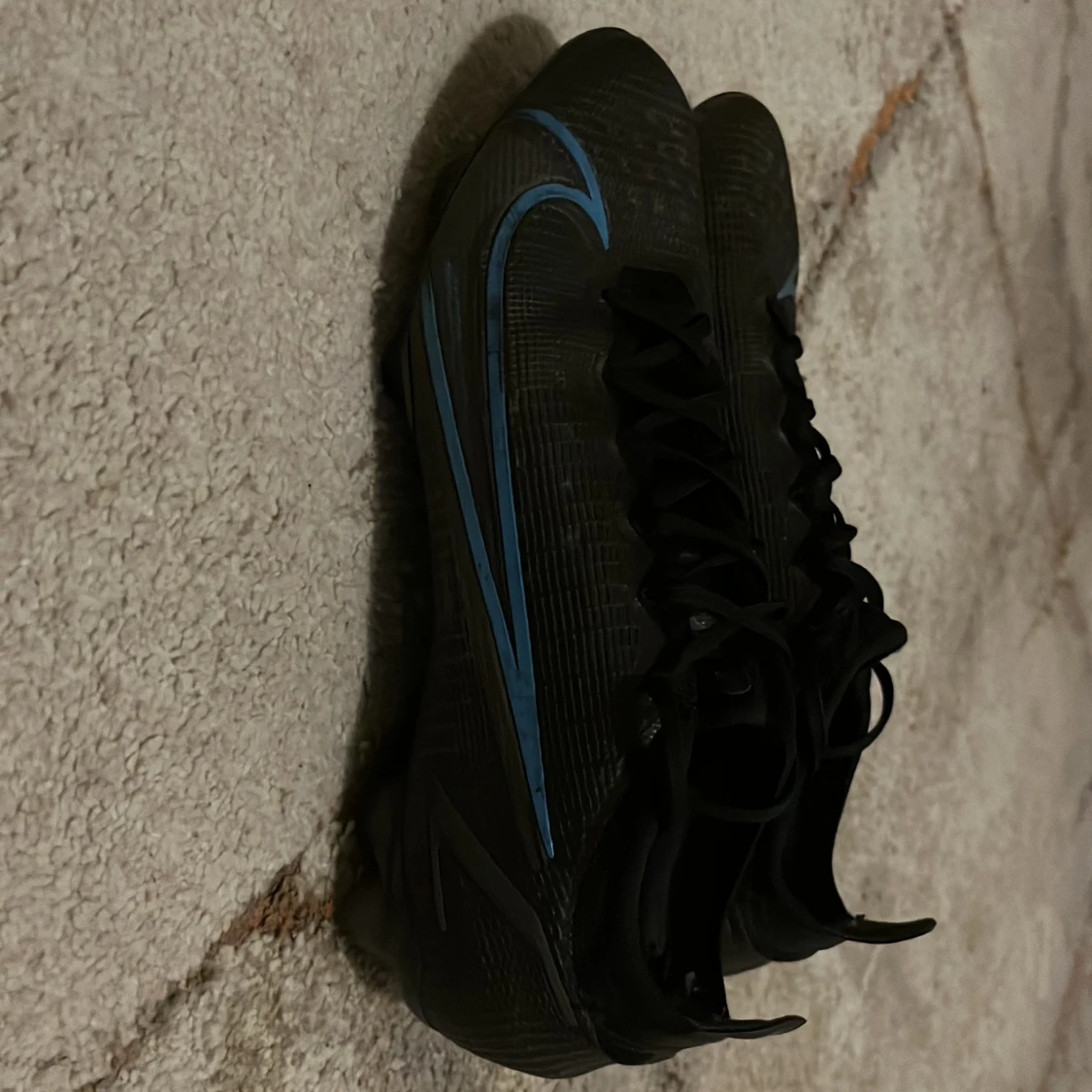 Snygga svarta fotbollsskor med blå detaljer och snörning. Perfekta för fotbollsplanen med en stilren design och bra passform. Ny pris 3000 mitt pris 600