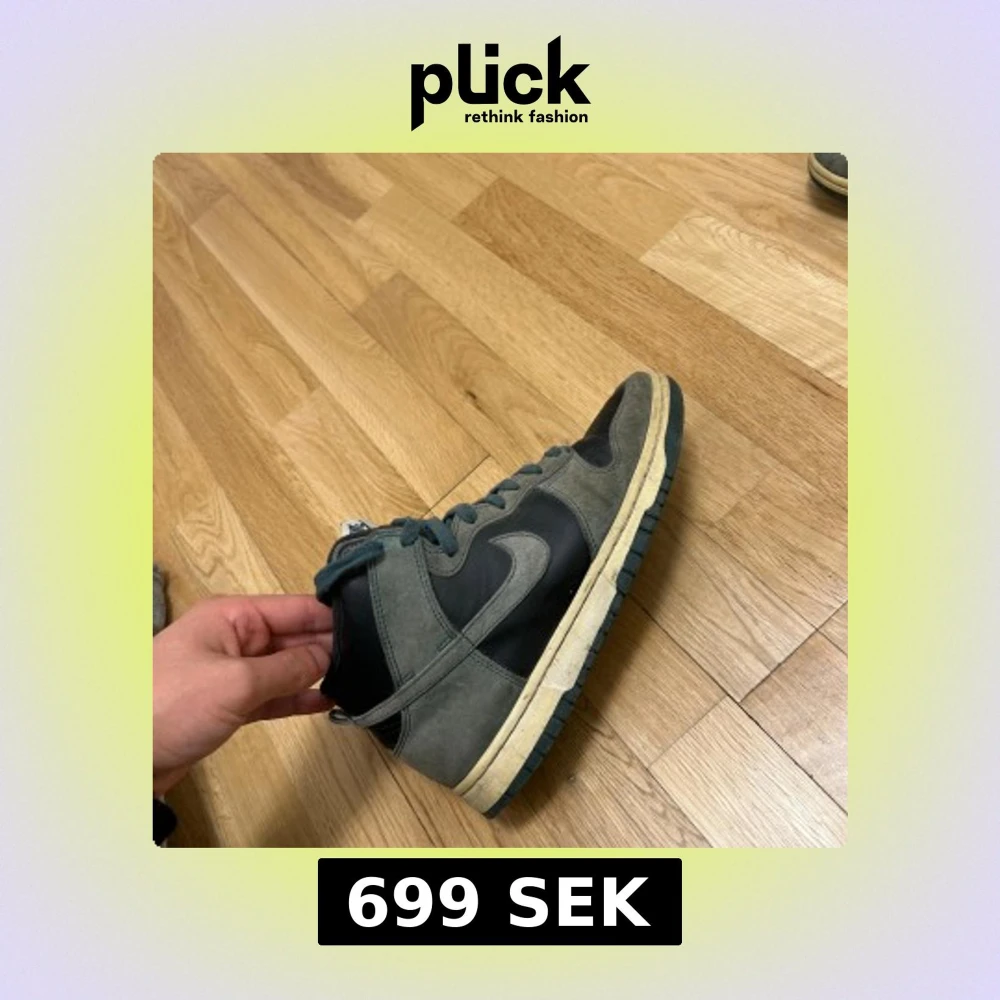 Säljer ett par Nike Dunk High sneakers i en snygg mix av grå mocka och svart läder. Skorna har klassisk Nike Swoosh på sidorna, gröna snören och en vintage-inspirerad sula. Perfekta för dig som gillar streetwear och vill sticka ut med en unik färgkombo.