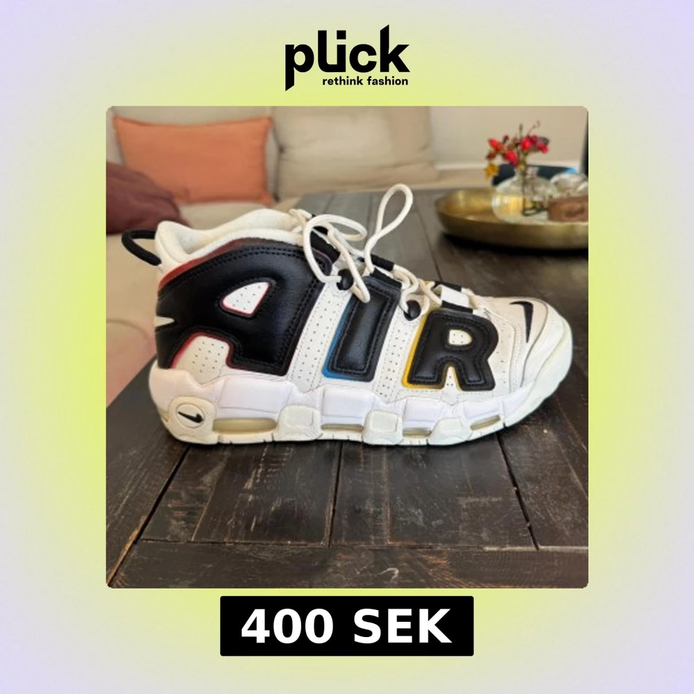Nike Air More Uptempo sneakers i vit och svart med stora AIR-bokstäver på sidorna, detaljer i blått, gult och rött. Skorna har snörning, platt sula och rund tå. Tillverkade i skinn och syntetmaterial, med klassisk Swoosh-logga på tån och hälen. Perfekt för dig som gillar retro och bold stil.