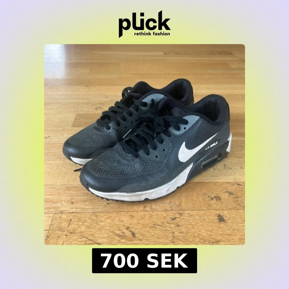 Säljer ett par svarta Nike Air Max Golf sneakers med vit sula och vit swoosh-logga på sidan. Skorna har snörning och en synlig Air Max-dämpning i sulan. Pris kan förhandlas!