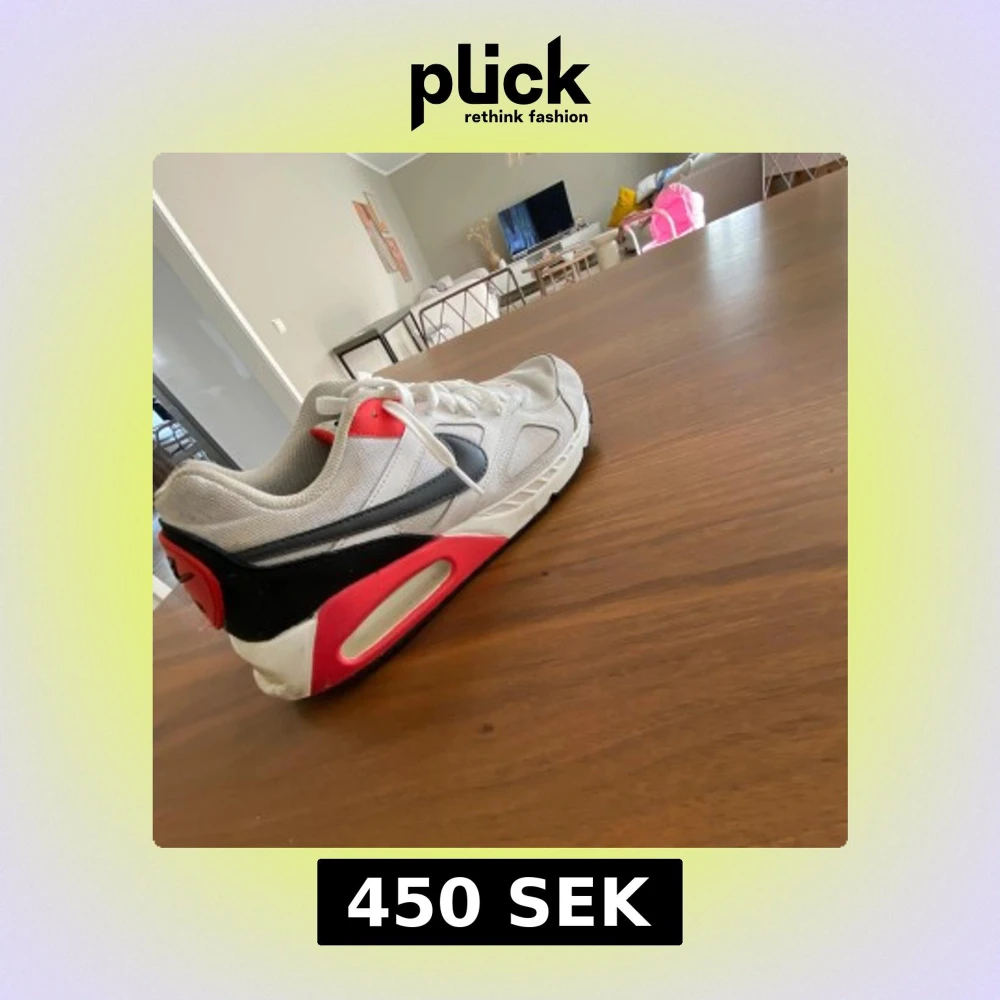 Snygga Nike Air Max sneakers i vitt med röda och svarta detaljer. Skorna har en klassisk design med synlig luftdämpning i hälen och snörning framtill. Perfekta för en sportig look.