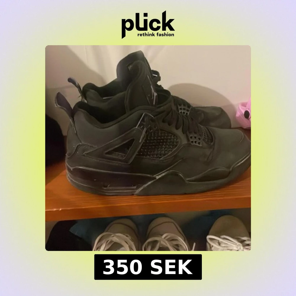 Säljer ett par helsvarta Nike Air Jordan 4 sneakers med klassisk meshpanel på sidorna, snörning och ikonisk Jumpman-logga på plösen. Skorna har en chunky sula och coola detaljer i syntet och skinn för en riktigt streetig vibe. de är i helt okej skick. Jag har använt dem i några månader.