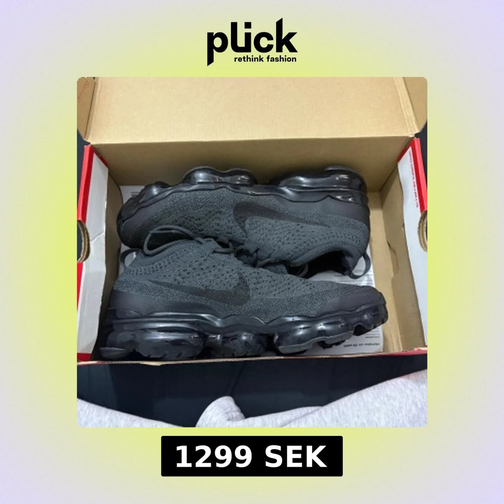 Nike Air Vapormax 2023 PK i helsvart färg med stickad ovandel och synlig Vapormax-bubbel-sula. Snygg, modern design med diskret Nike-logga på sidan och Vapormax-detalj på plösen och hälen. Skorna har snörning och rund tå, perfekt för dig som gillar techiga sneakers.