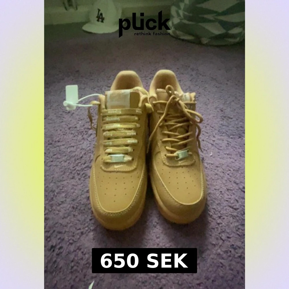 Nike Air Force 1 Supreme i wheat-färg med Supreme branding på sidan och innersulan. Snygga låga sneakers med rund tå, platt gummisula och snörning. Ovandelen är i skinn med detaljerade sömmar och Supreme-logga på skosnörena. Perfekt för dig som gillar streetwear och exklusiva collabs.