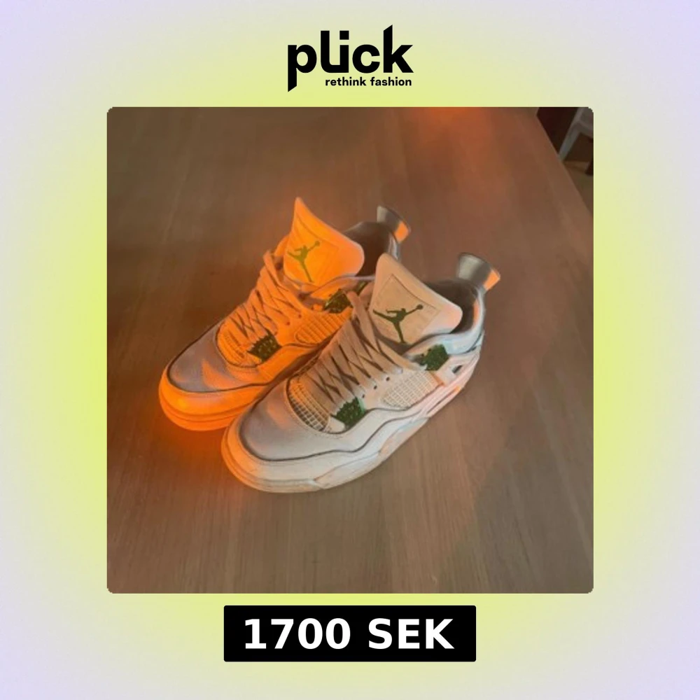 Snygga Nike Air Jordans i vitt med gröna detaljer. Skorna har en klassisk design med snörning och den ikoniska Jumpman-loggan. Perfekta för dig som vill ha en stilren look med en touch av färg.