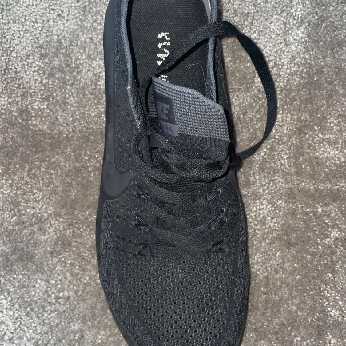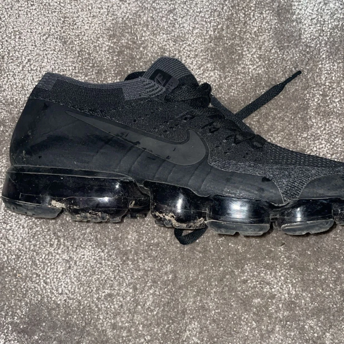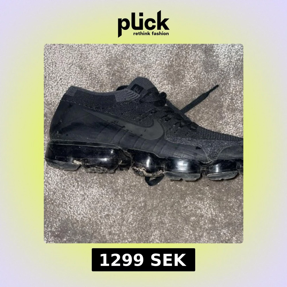 Säljer ett par helsvarta Nike Vapormax sneakers med stickad ovandel och tydlig Nike-logga på sidan. Skorna har snörning och den klassiska genomskinliga bubbliga sulan som ger en futuristisk look. Perfekta för dig som gillar streetwear och sportig stil.