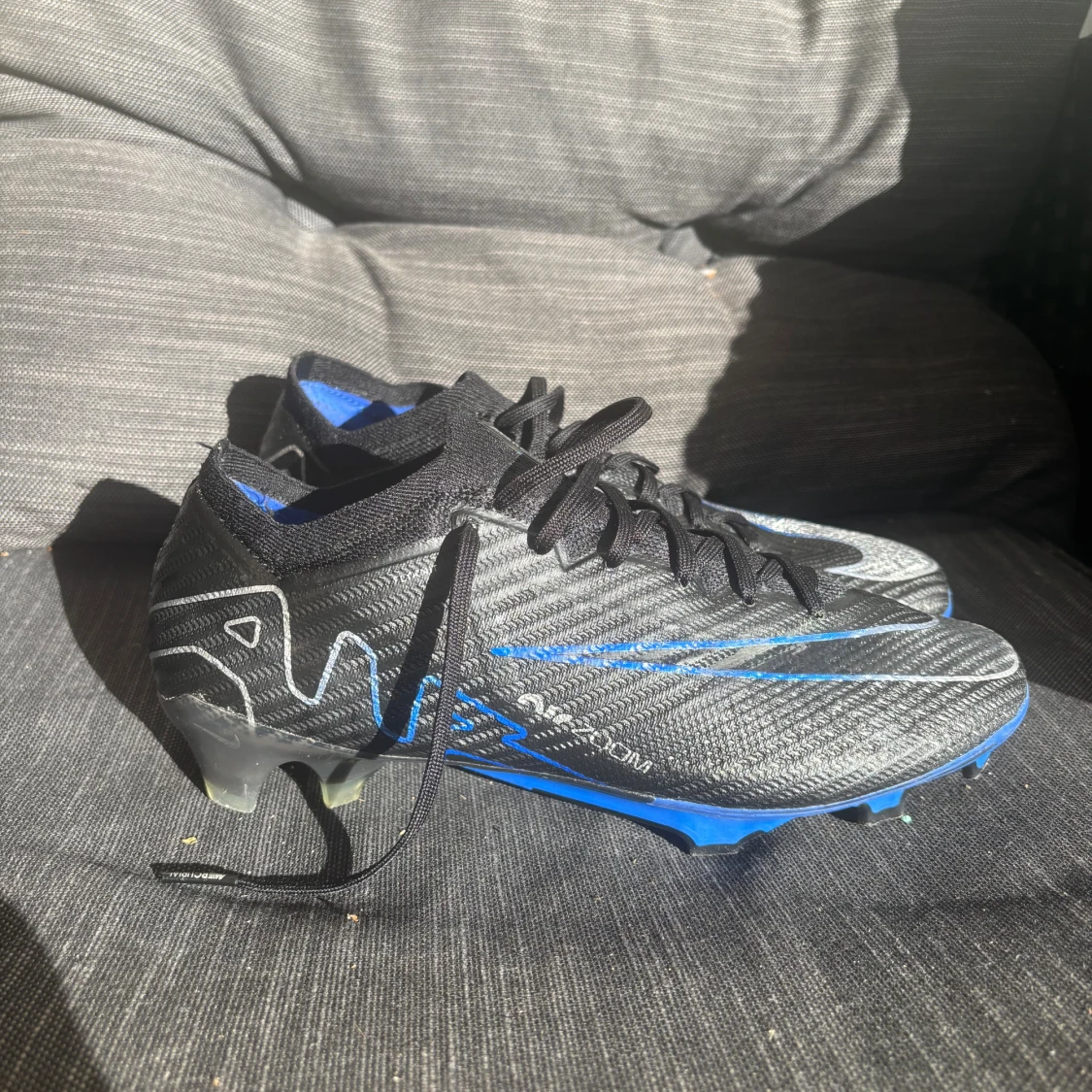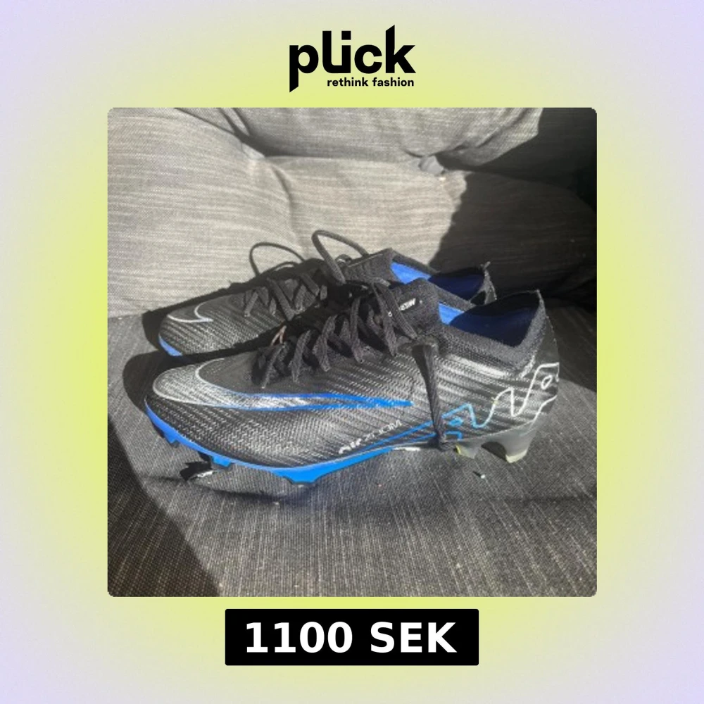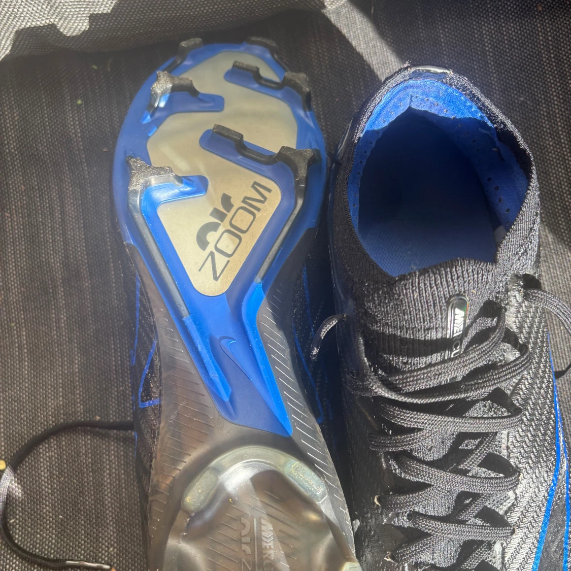 Säljer ett par Nike Mercurial Air Zoom fotbollsskor i svart och blått med silvriga detaljer. Skorna har snörning, platt sula med dobbar och en strumpliknande öppning för extra komfort. Ovandelen är tillverkad i syntetmaterial med mönstrad yta och coola grafiska linjer.