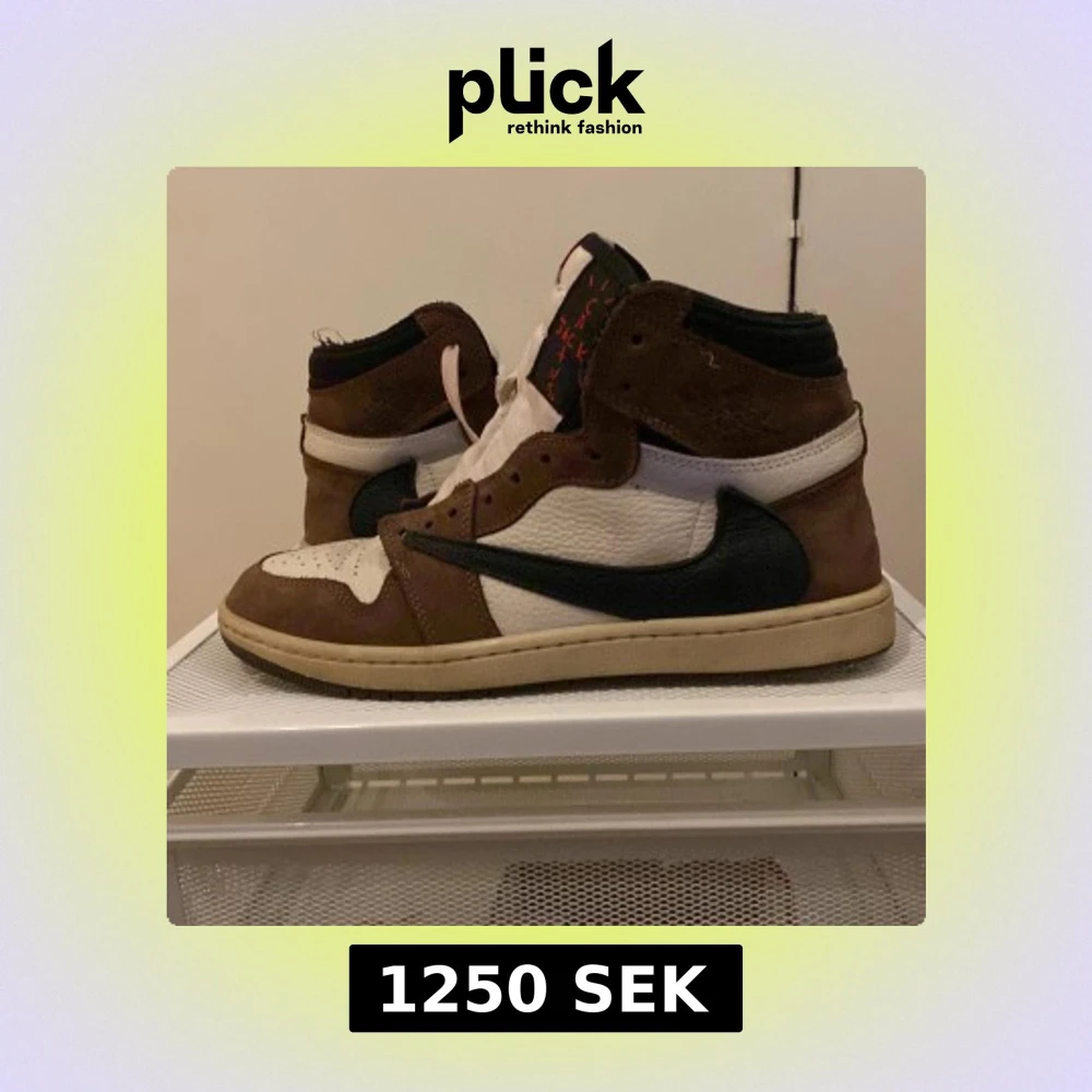 Säljer ett par Nike Air Jordans i brunt och vitt med svarta detaljer. Skorna har en klassisk hög design med snörning och en tydlig Nike-logga på sidan. Perfekta för sneakerheads som vill ha en stilren look. Kan gå ner i pris vid snabb affär.