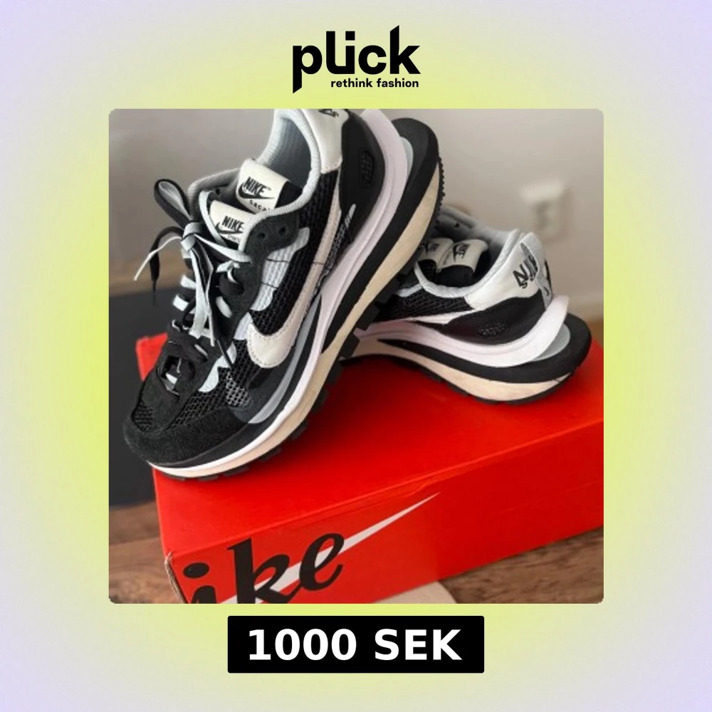 Nike x Sacai sneakers i svart och vitt med dubbla snören och cool mesh-paneler. Snygg vågig design på sidan, vit swoosh och chunky sula. Kombination av mocka och mesh ger en modern vibe. Perfekta för dig som vill sticka ut med streetstyle. Jag har två stycken. Size 41 och 36