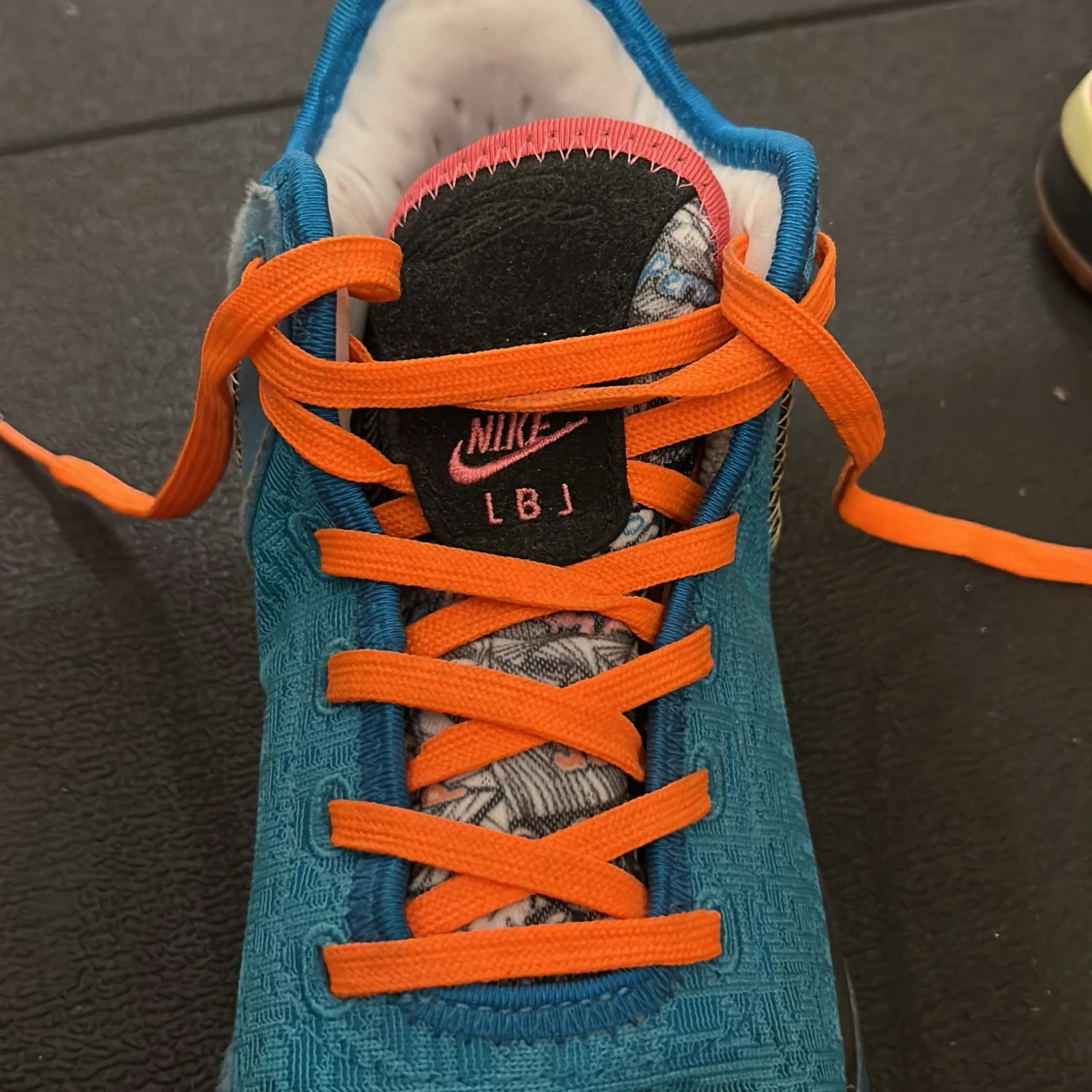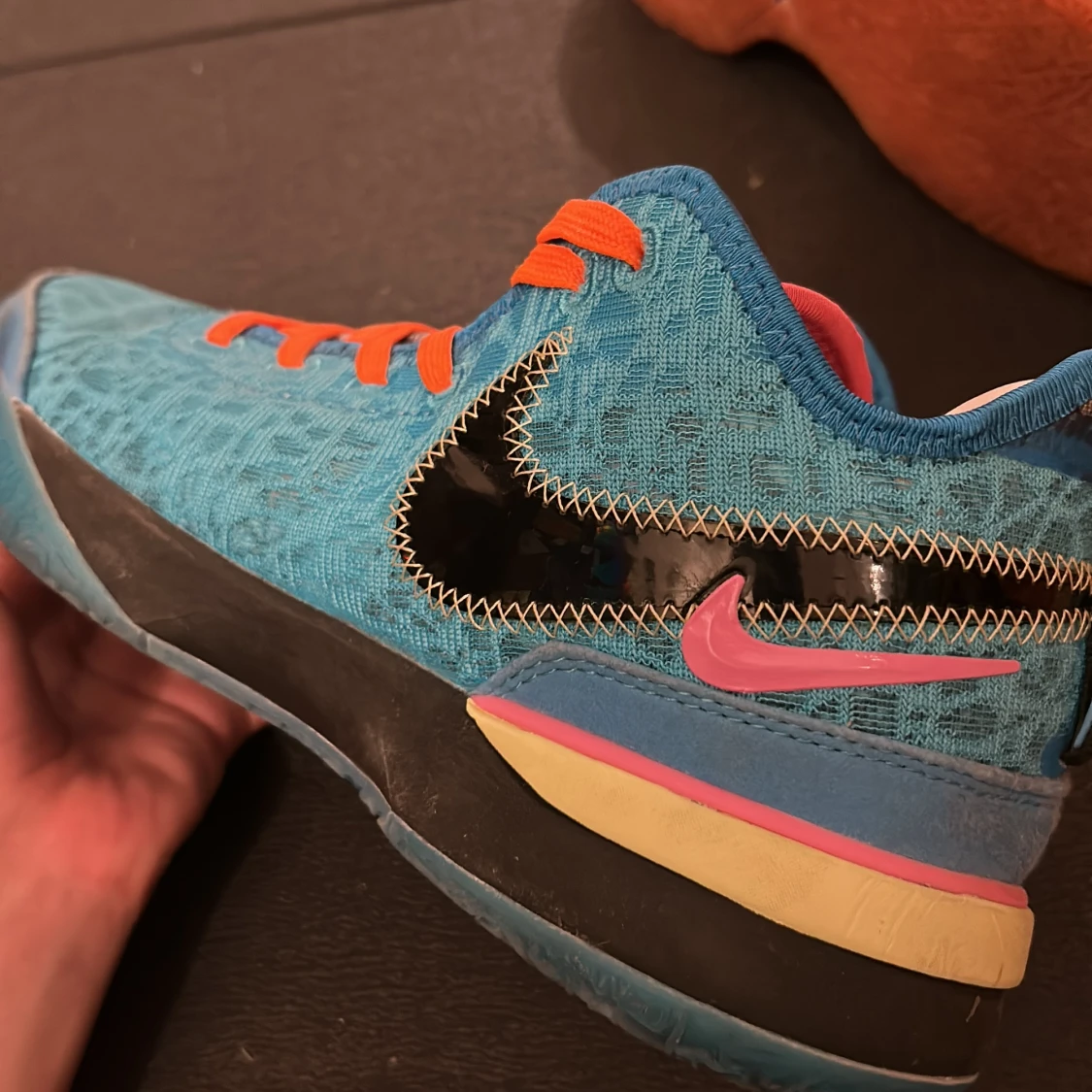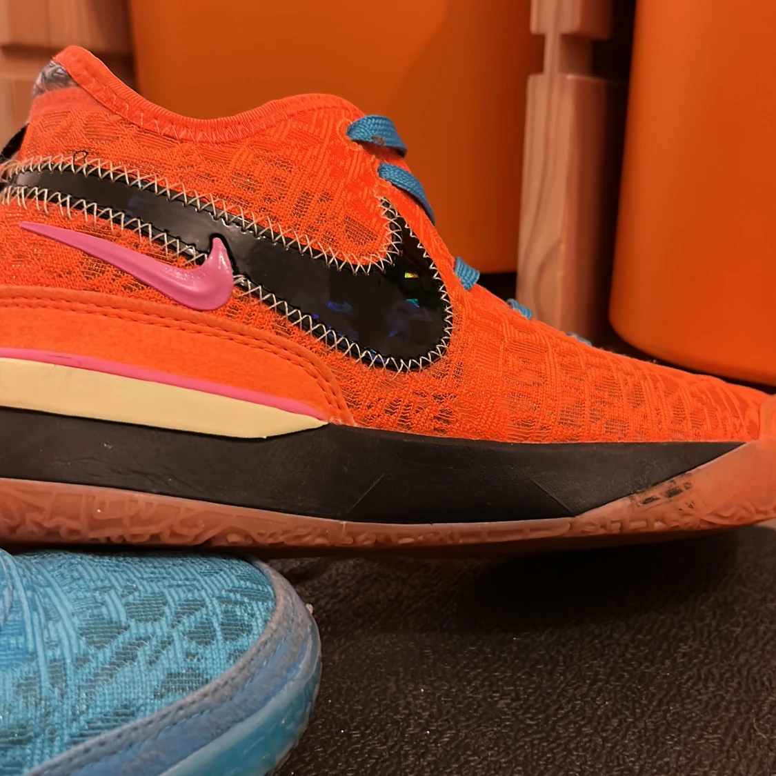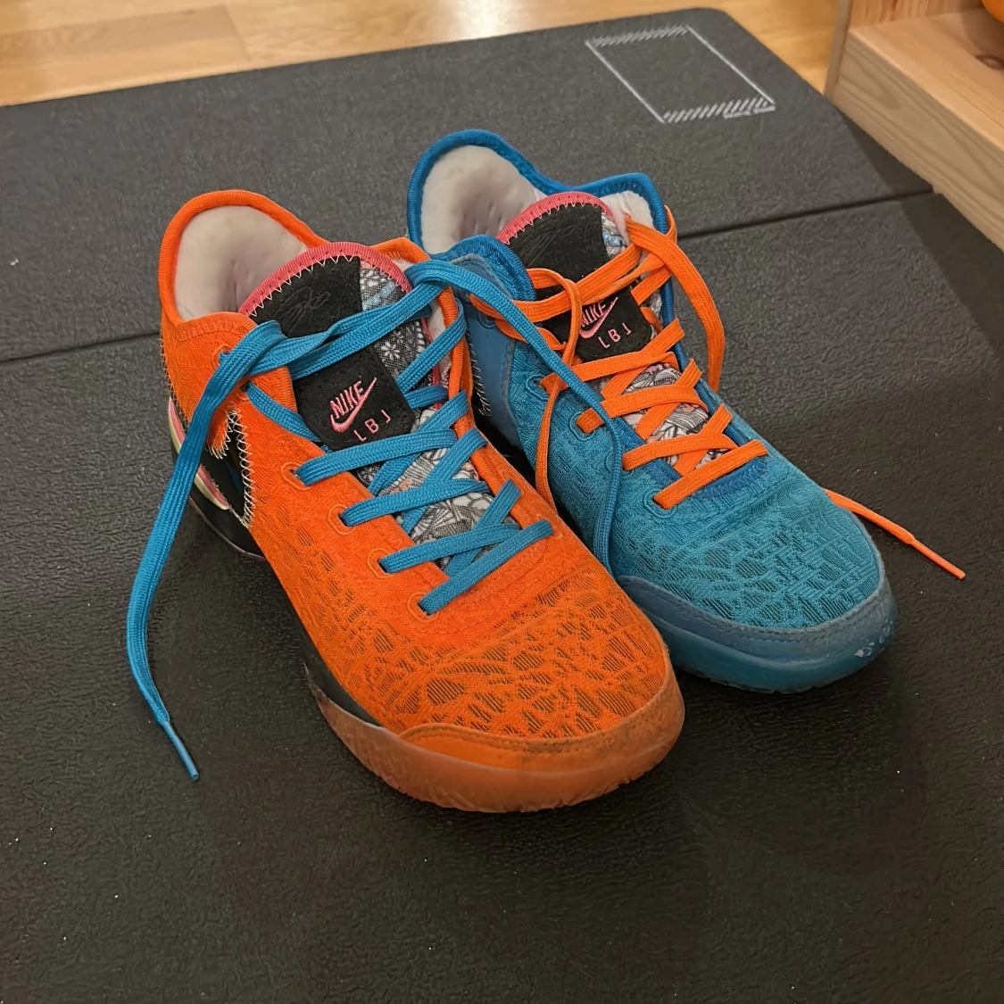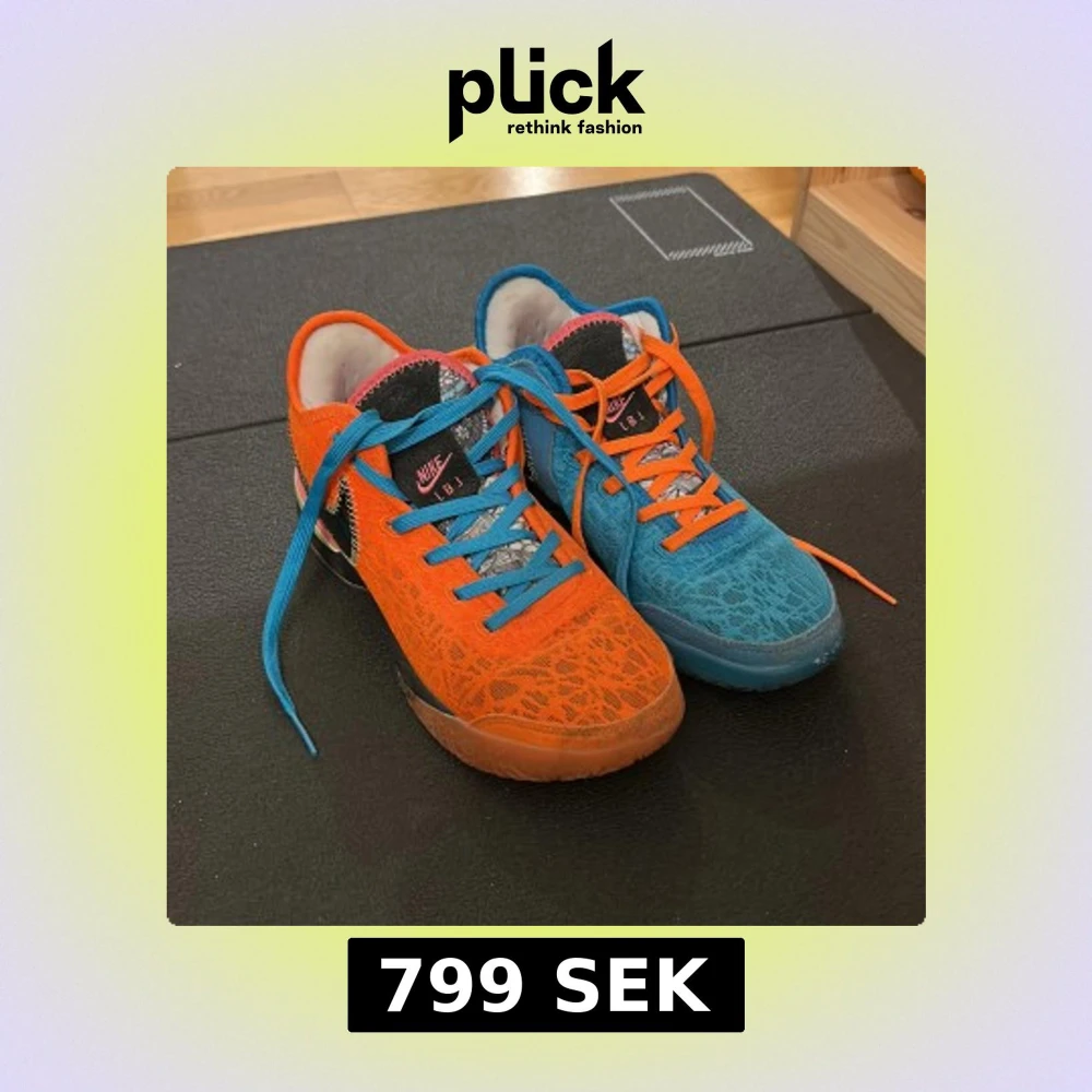 Unika Nike LBJ sneakers med mismatched design – ena skon är blå med orange snörning, den andra orange med blå snörning. Båda har svart och rosa Swoosh, broderade detaljer och mönstrad mesh-överdel. Färgglad sula med inslag av gult och rosa. Perfekta för dig som vill sticka ut. Original pris är unge 2300kr