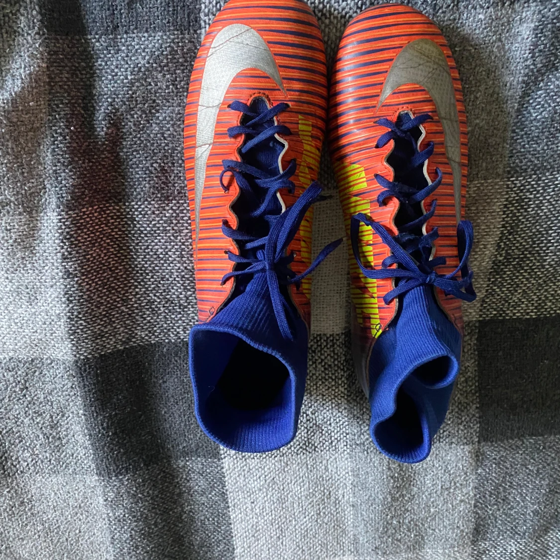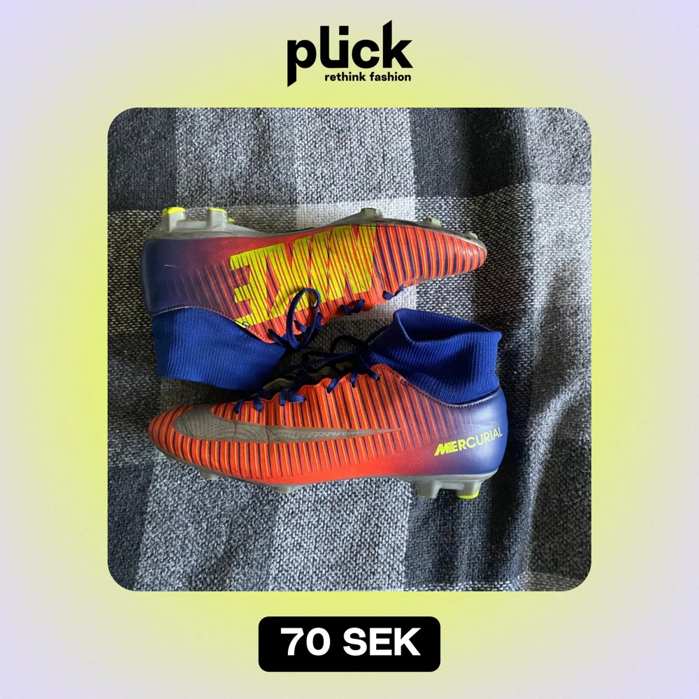 Säljer ett par Nike Mercurial fotbollsskor i rött och blått med gula detaljer. Skorna har en tight passform och snörning för bästa komfort på planen. De är i bra skick med lite slitage på sulorna. Perfekta för fotbollsträning eller match!