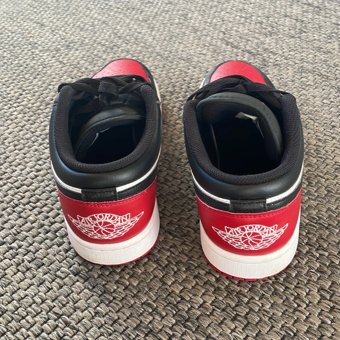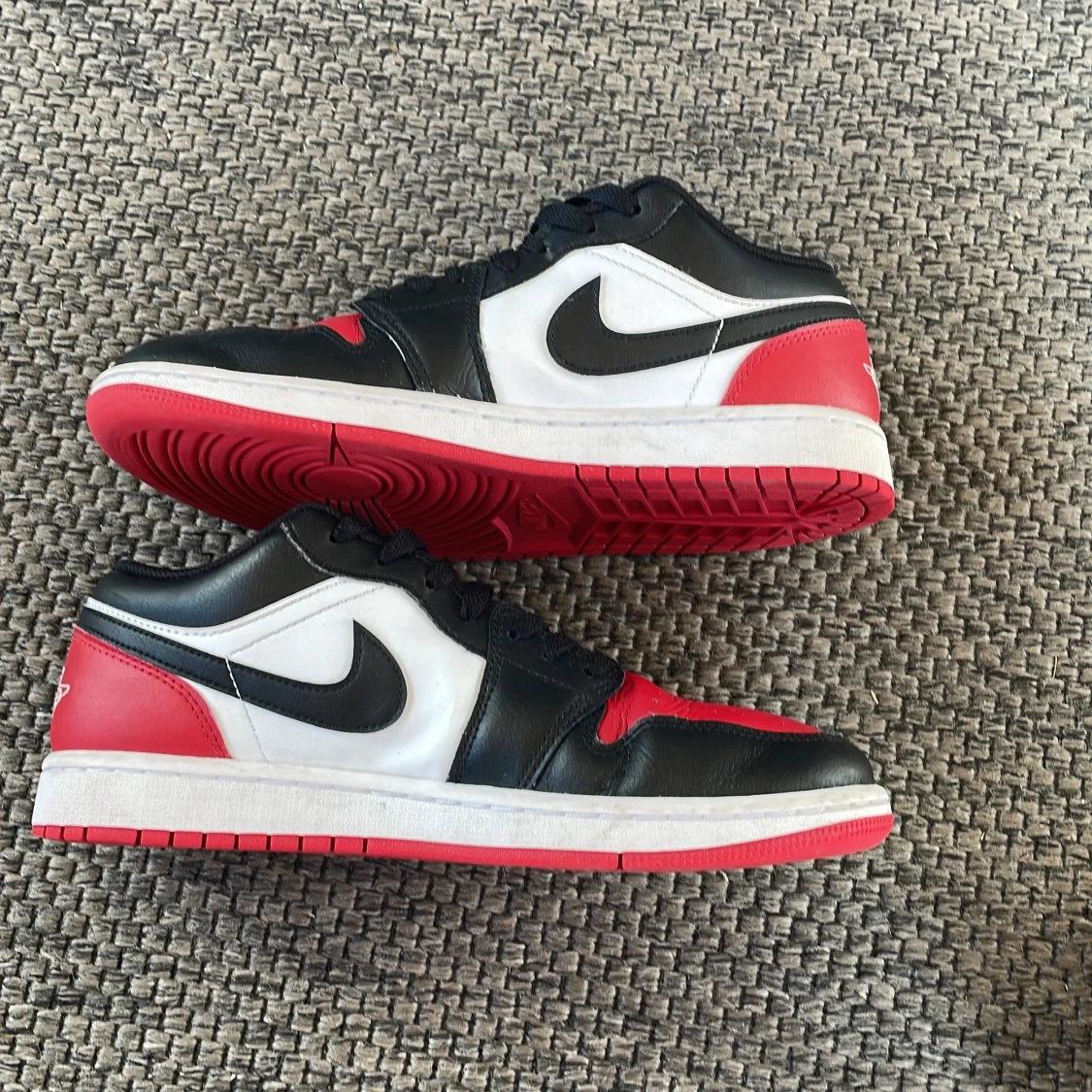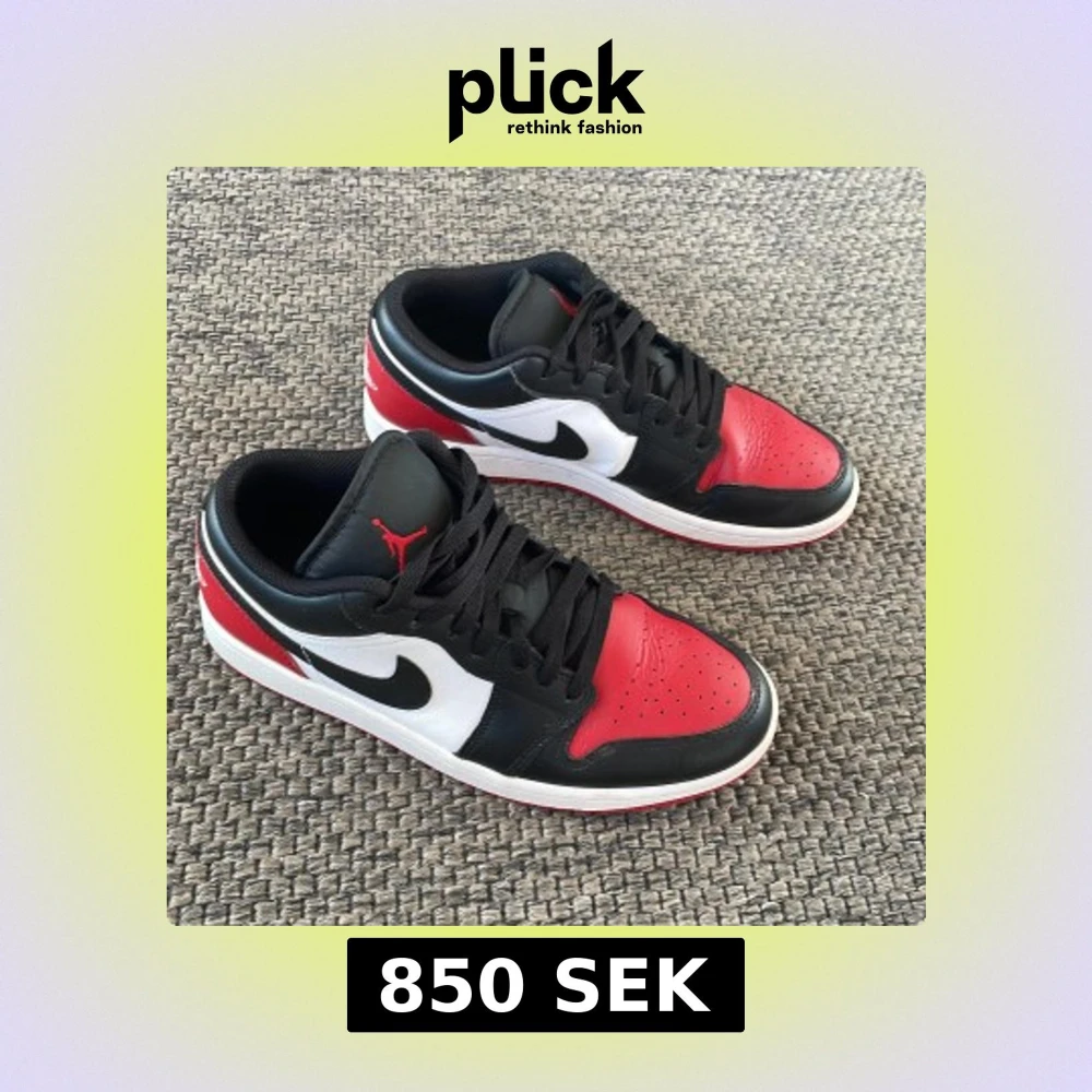 Säljer ett par Nike Air Jordans Low med klassisk färgkombination i svart, rött och vitt. De är köpta i USA och jag har ingen box men skorna är nästan oanvända. Nya kostar mellan 1500-1700kr