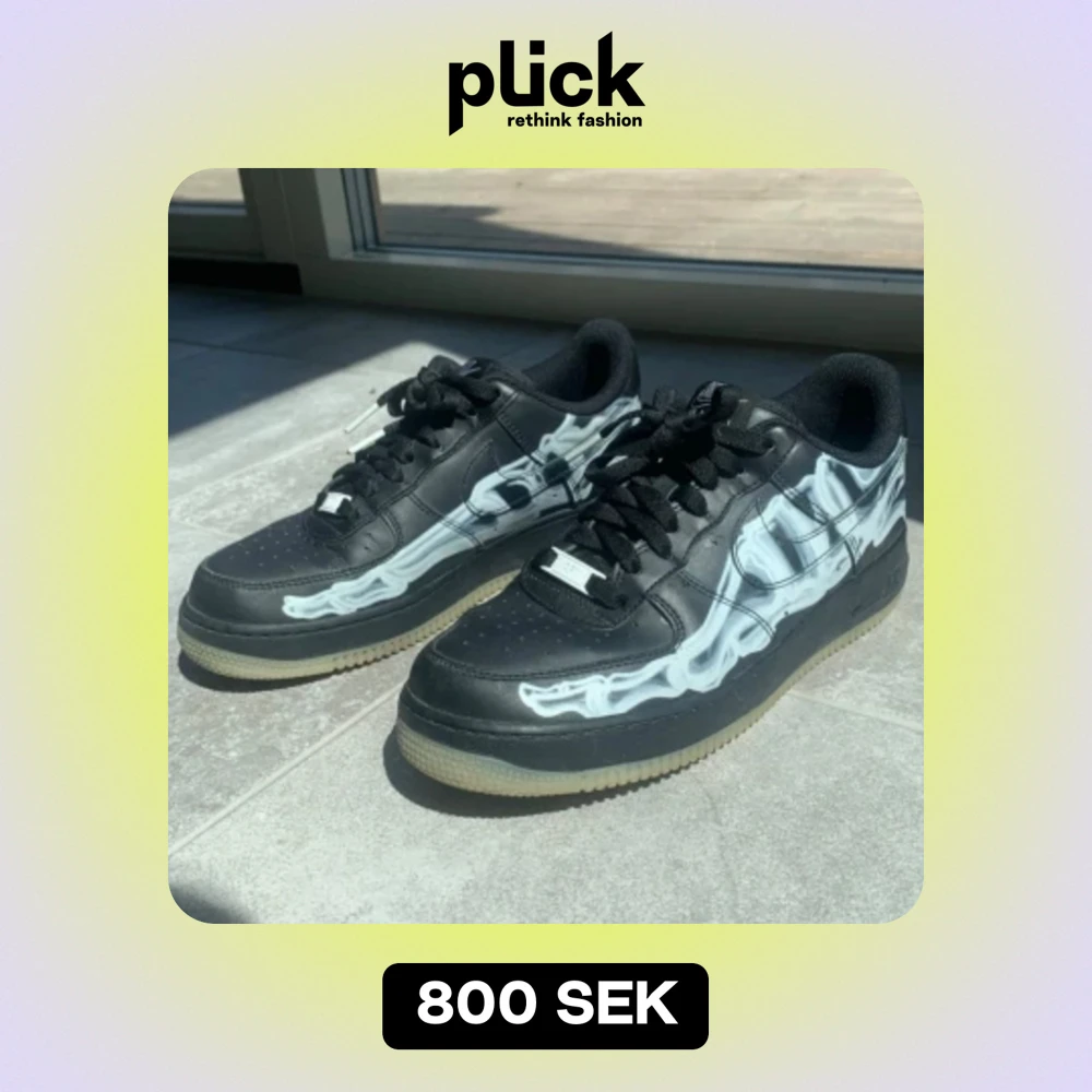 Säljer nu mina Nike Air Force 1 Low Black Skeleton Halloween(2019). Använda ungefär 1-2 gånger i veckan år 2021. Tyvärr medföljer ingen låda. Jag skulle säga att cond är 7/10.