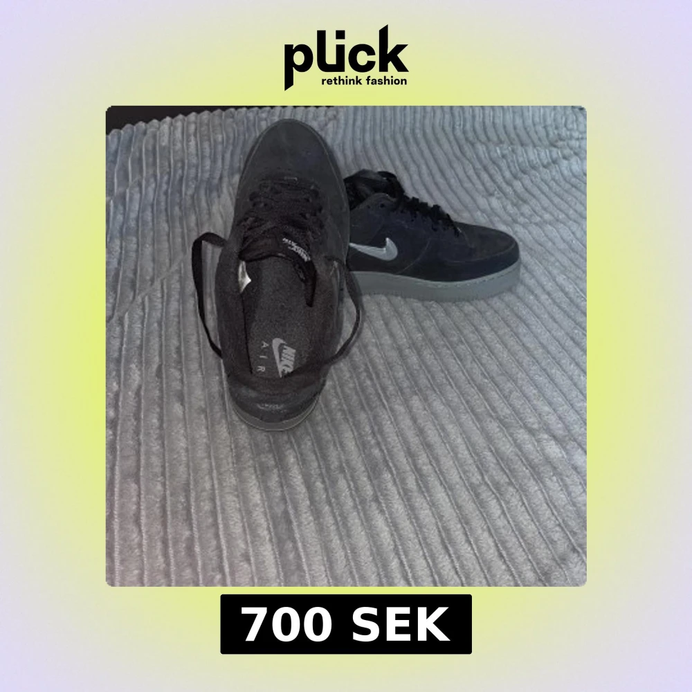 Snygga Nike Air Force 1 sneakers i svart mocka med silverfärgad swoosh och grå sula. Klassisk låg modell med snörning och rund tå. Perfekta för dig som gillar stilrena och tidlösa sneakers med en twist. Passar bra för vinter använd 5 gånger köpt för 1200 säljer de eftersom jag har köpt nya skor