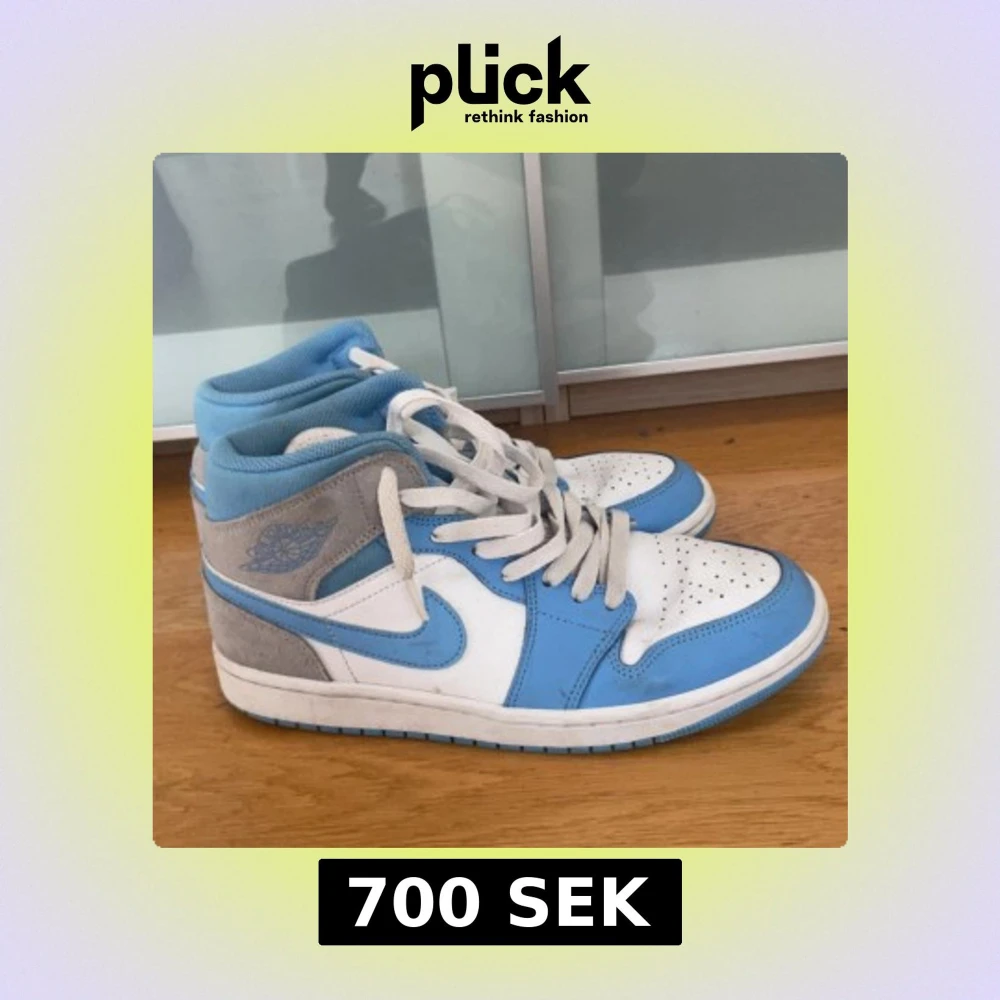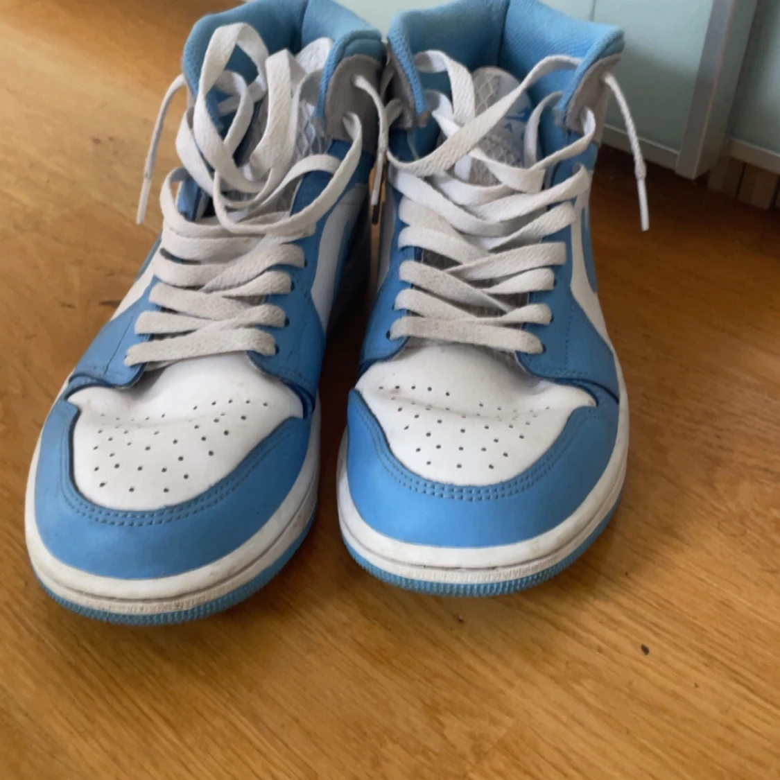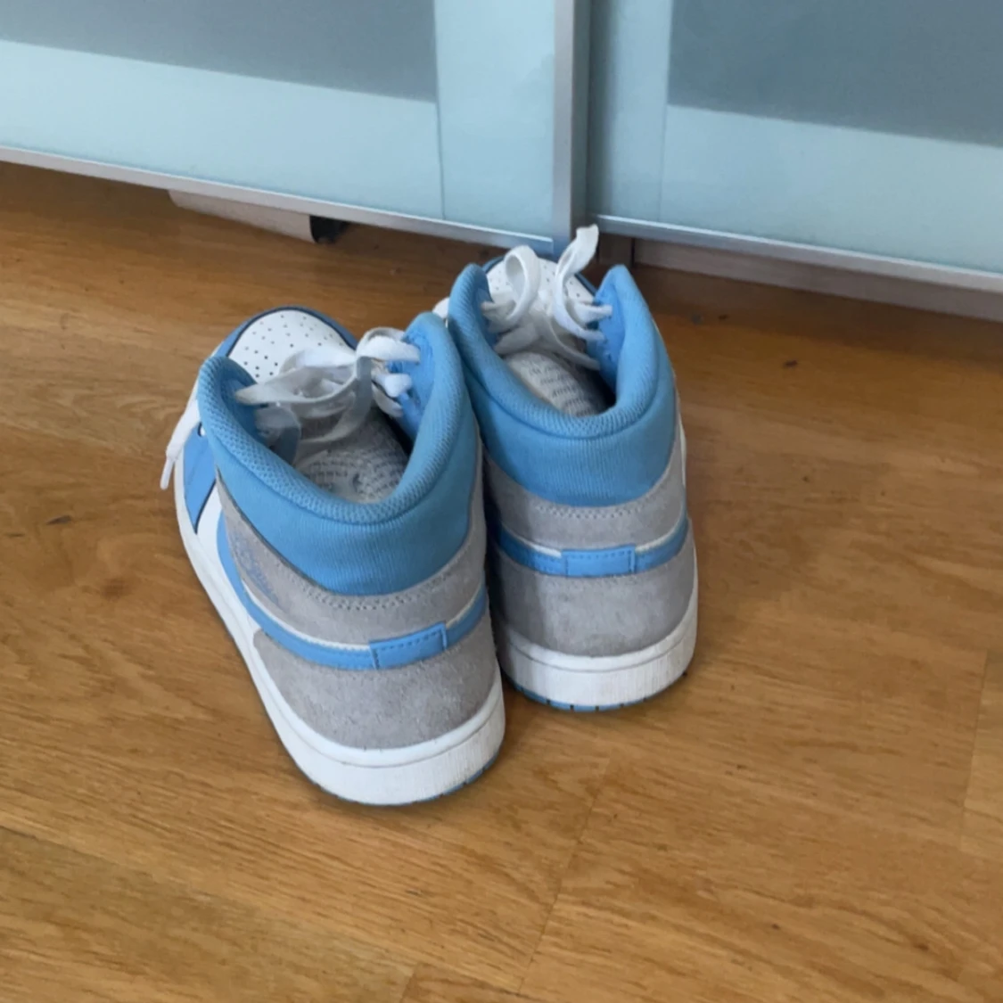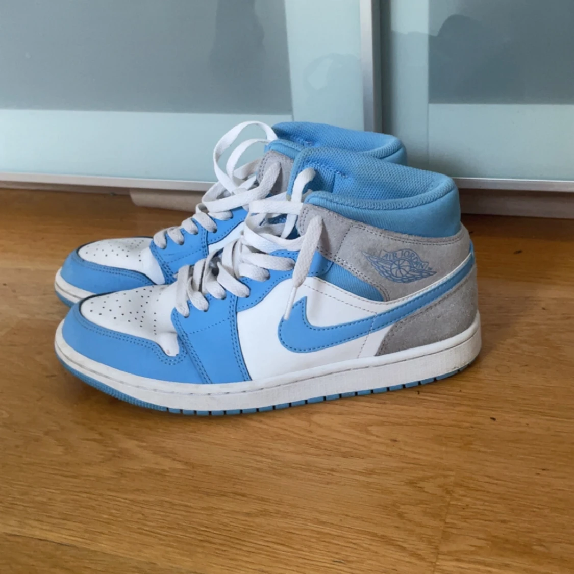 Säljer ett par Nike Air Jordans med vit bas, ljusblå detaljer och grå mocka vid hälen. Skorna har snörning och rund tå, samt klassisk Air Jordan-logga på sidan. Perfekta för dig som gillar streetwear och sneakers med stil.