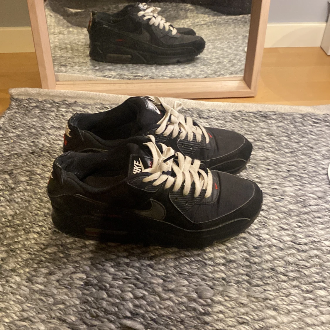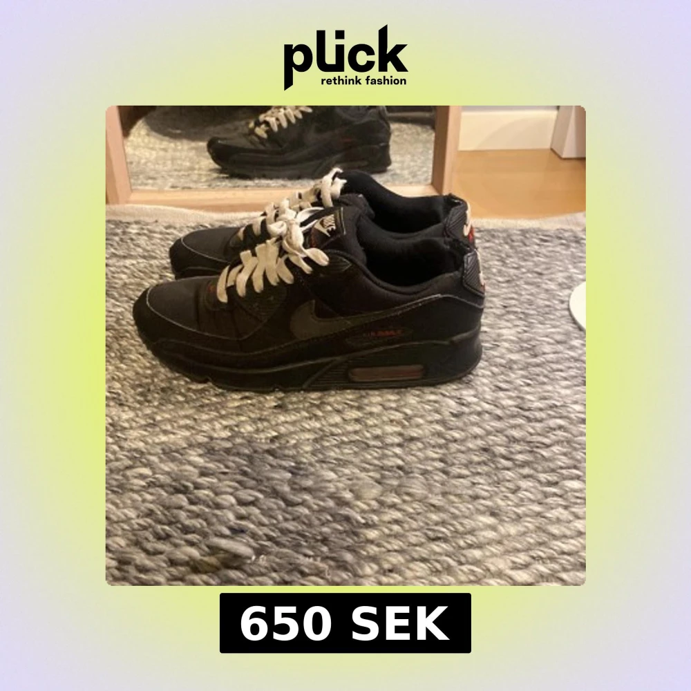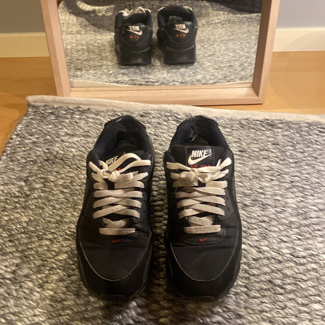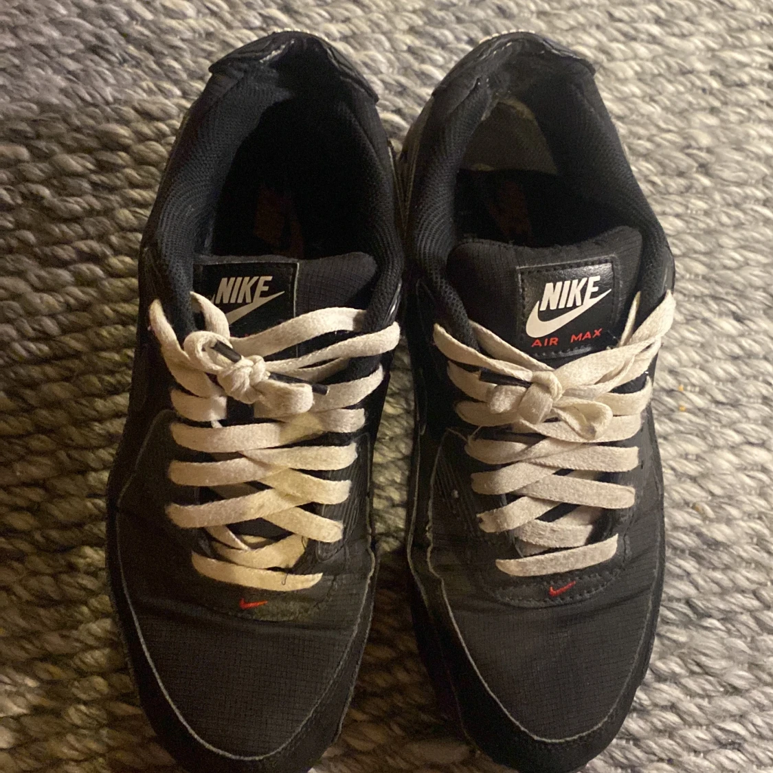 Säljer ett par svarta Nike Air Max sneakers med vit snörning. Skorna har en klassisk design med synlig luftdämpning i sulan och Nike-logga på plösen. Skick 6/10